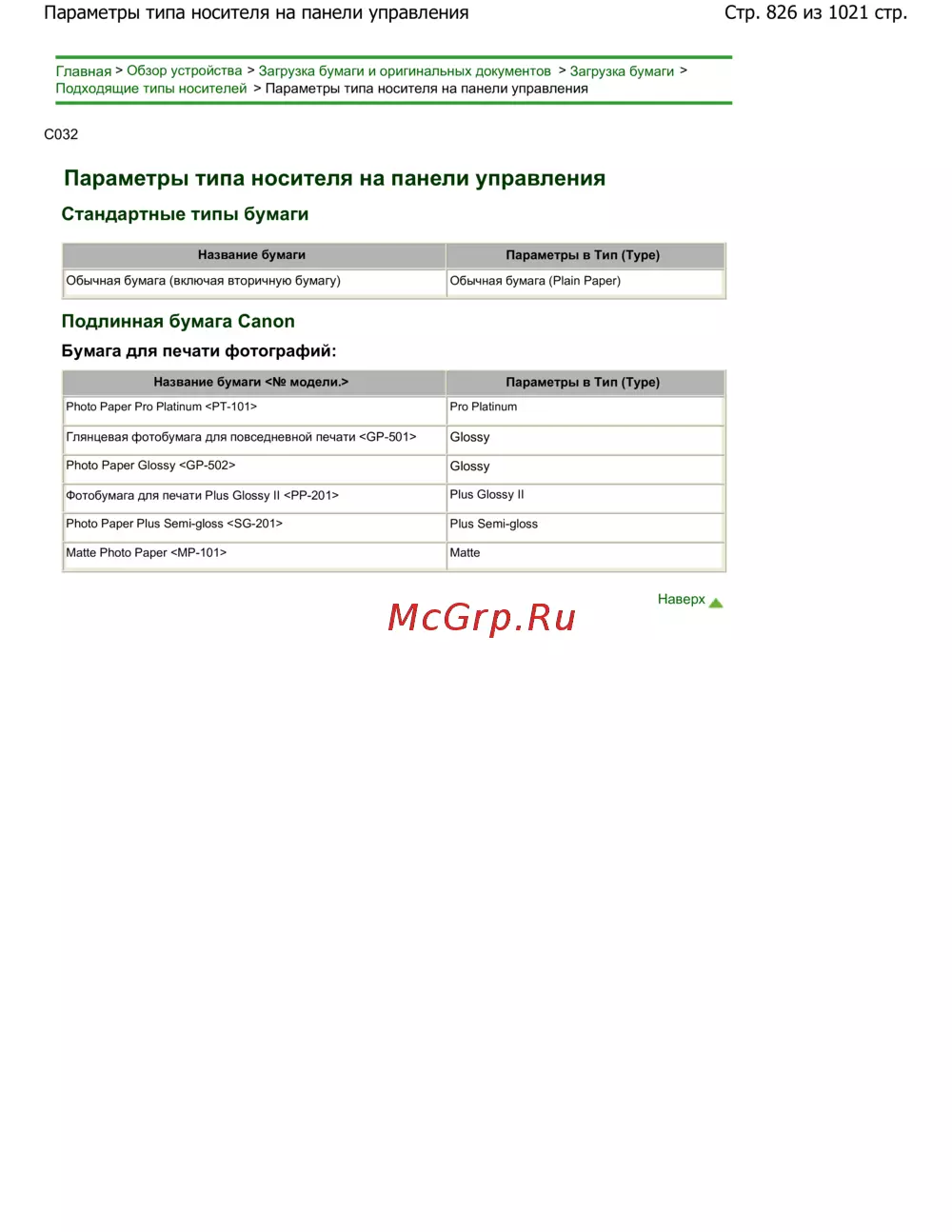 Стр. 826 из 1021 стр.Параметры типа носителя на панели управления