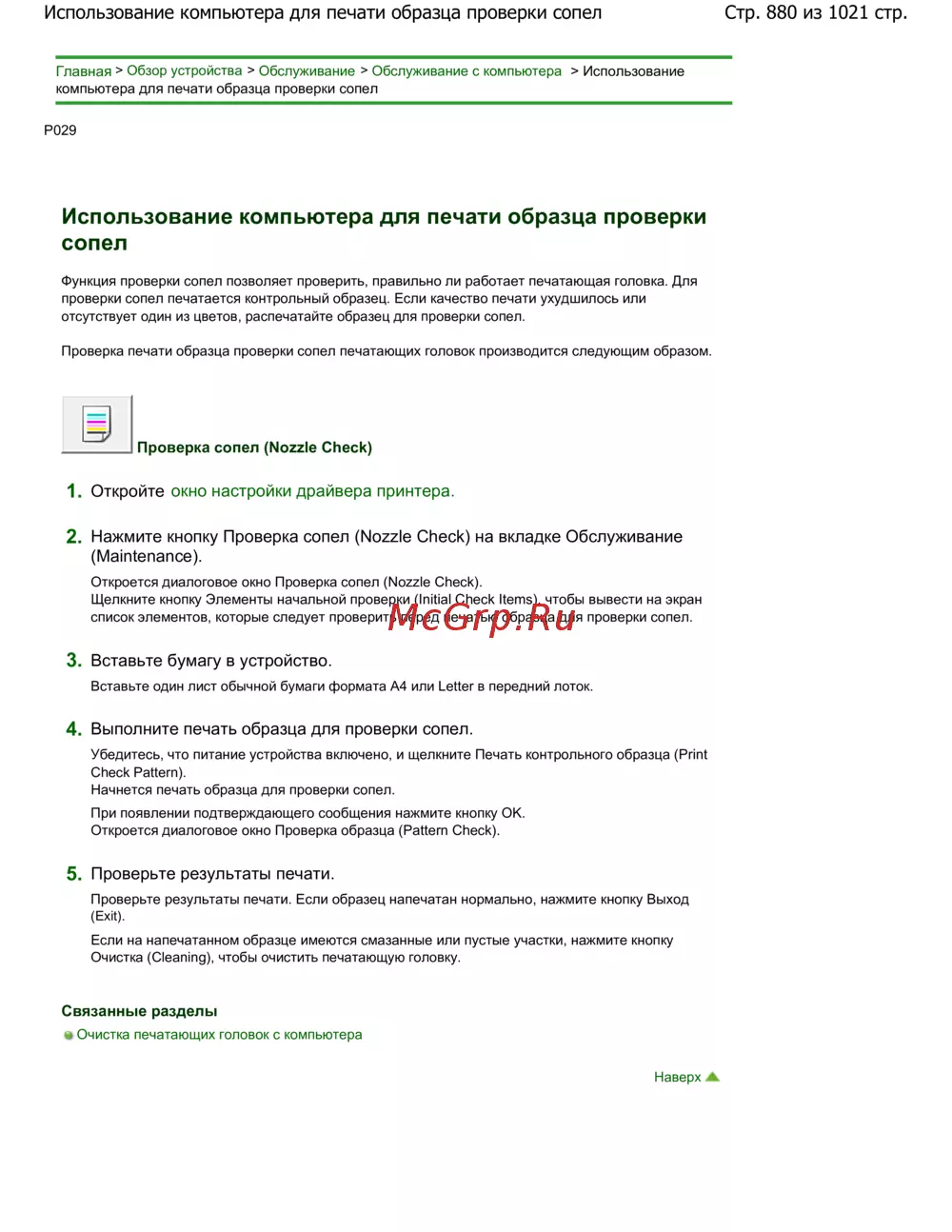 Стр. 880 из 1021 стр.Использование компьютера для печати образца проверки сопел