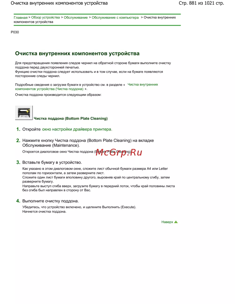 Нажмите кнопку Чистка поддона (Bottom Plate Cleaning) на вкладке