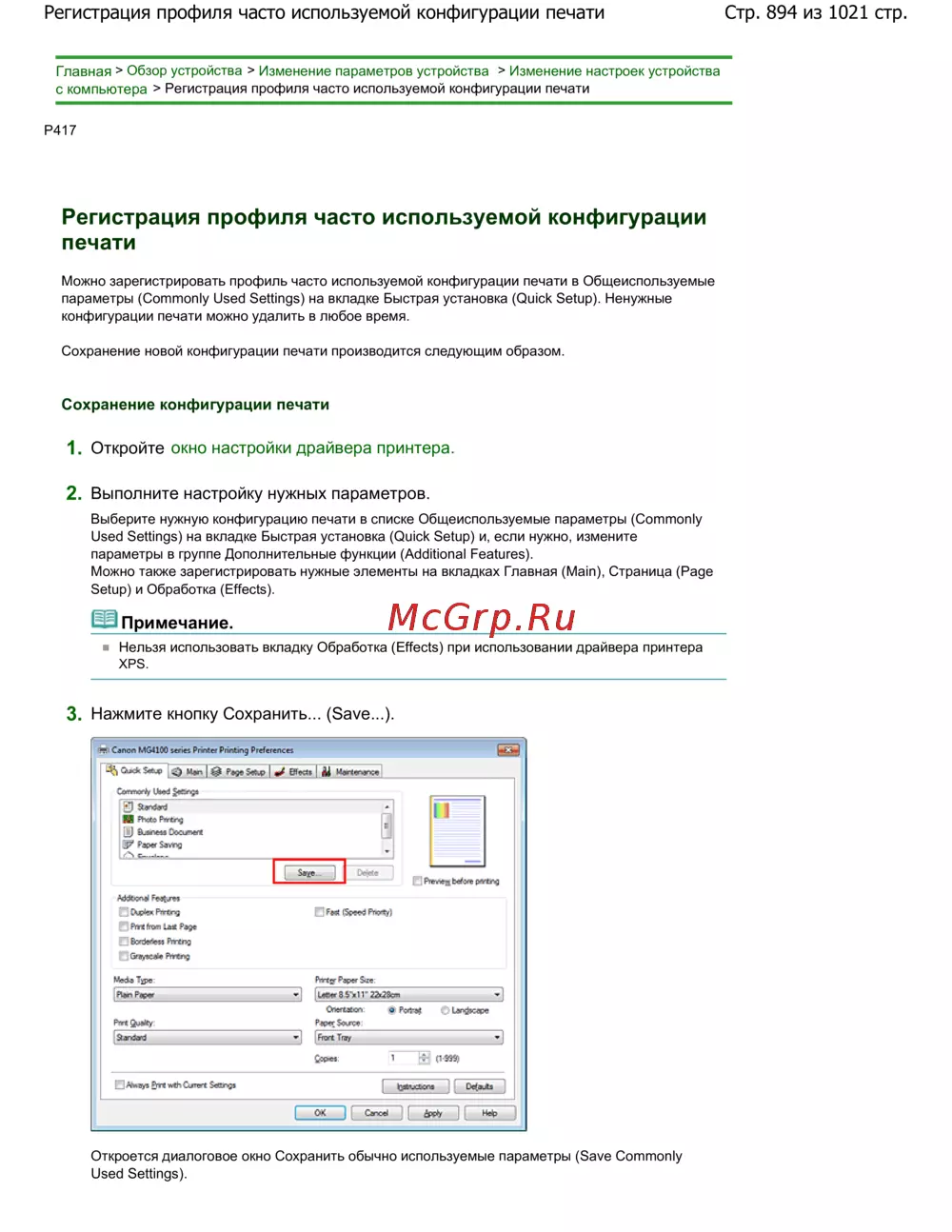 Стр. 894 из 1021 стр.Регистрация профиля часто используемой конфигурации печати