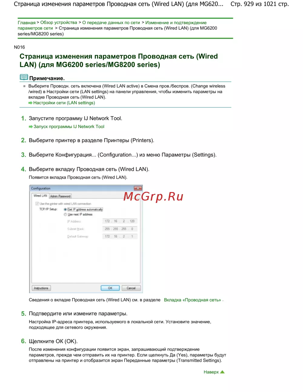 Стр. 929 из 1021 стр.Страница изменения параметров Проводная сеть (Wired LAN) (для MG620...