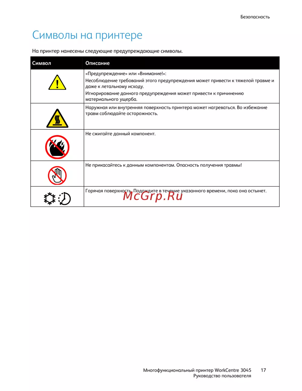 Узнайте о предупреждающих символах и мерах безопасности при использовании многофункционального принтера. Соблюдайте осторожность для предотвращения травм и ущерба.