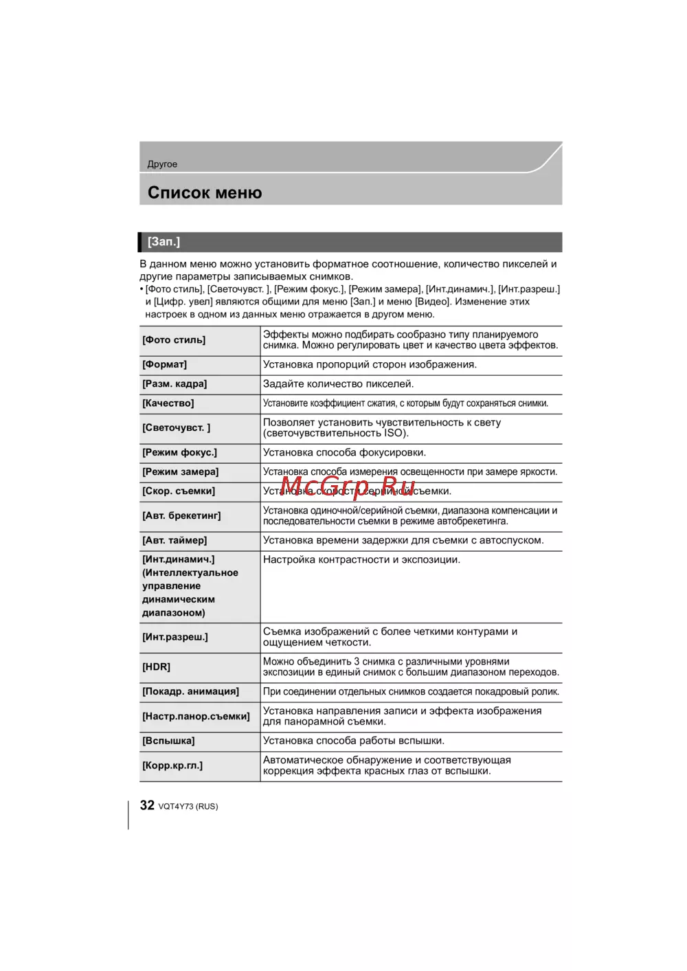 - В данном меню можно установить форматное соотношение количество пикселей и другие параметры записываемых снимков p.32