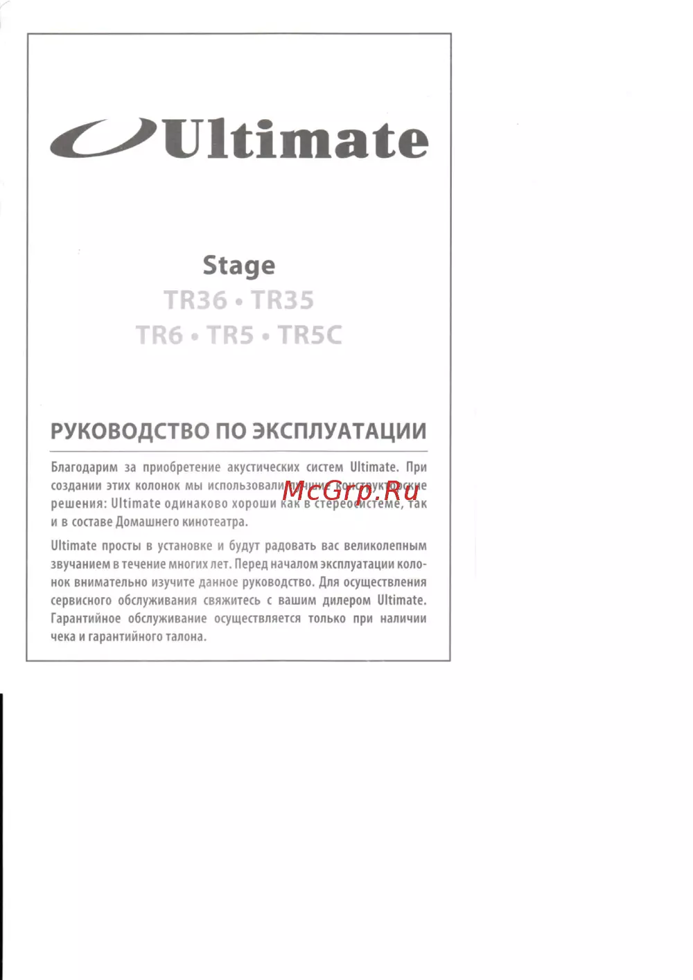 Stage TR36 TR35 TR6 TR5 TR5C РУКОВОДСТВО ПО ЭКСПЛУАТАЦИИ Благодарим за приобретение акустических систем Ultimate При создании этих колонок мы использовали лучшие конструкторские решения Ultimate одинаково хороши как в стереосистеме так и в составе Домашнего кинотеатра Ultimate просты в установке и будут радовать вас великолепным звучанием в течение многих лет Перед началом эксплуатации коло нок внимательно изучите данное руководство Для осуществления сервисного обслуживания свяжитесь с вашим дилером Ultimate Гарантийное обслуживание осуществляется только при наличии чека и гарантийного талона