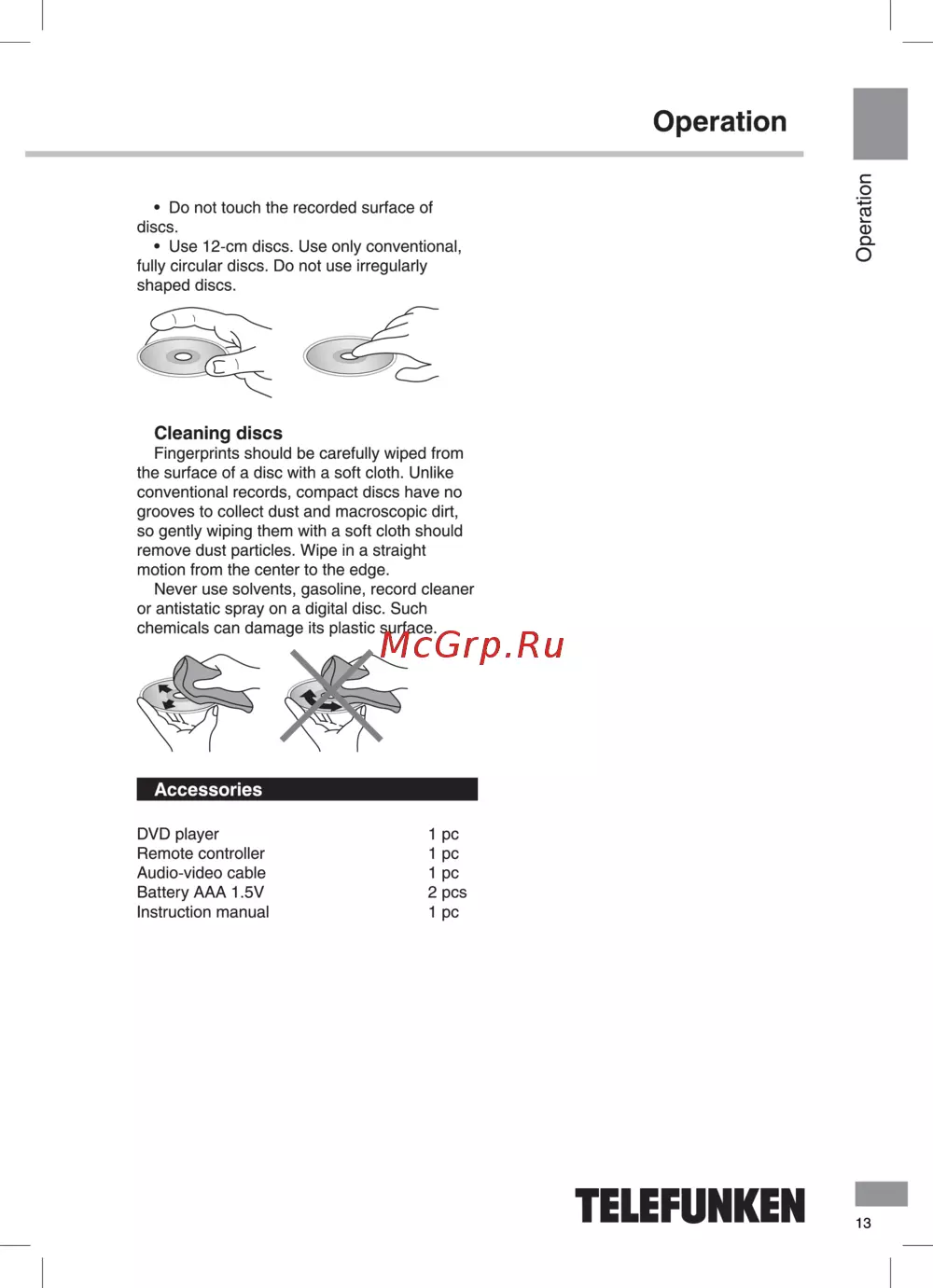 Operation Operation Do not touch the recorded surface of discs Use 12 cm discs Use only conventional fully circular discs Do not use irregularly shaped discs Cleaning discs Fingerprints should be carefully wiped from the surface of a disc with a soft cloth Unlike conventional records compact discs have no grooves to collect dust and macroscopic dirt so gently wiping them with a soft cloth should remove dust particles Wipe in a straight motion from the center to the edge Never use solvents gasoline record cleaner or antistatic spray on a digital disc Such chemicals can damage its plastic surface Accessories DVD player Remote controller Audio video cable Battery AAA 1 5V Instruction manual 1 pc 1 pc 1 pc 2 pcs 1 pc TELEFUNKEN