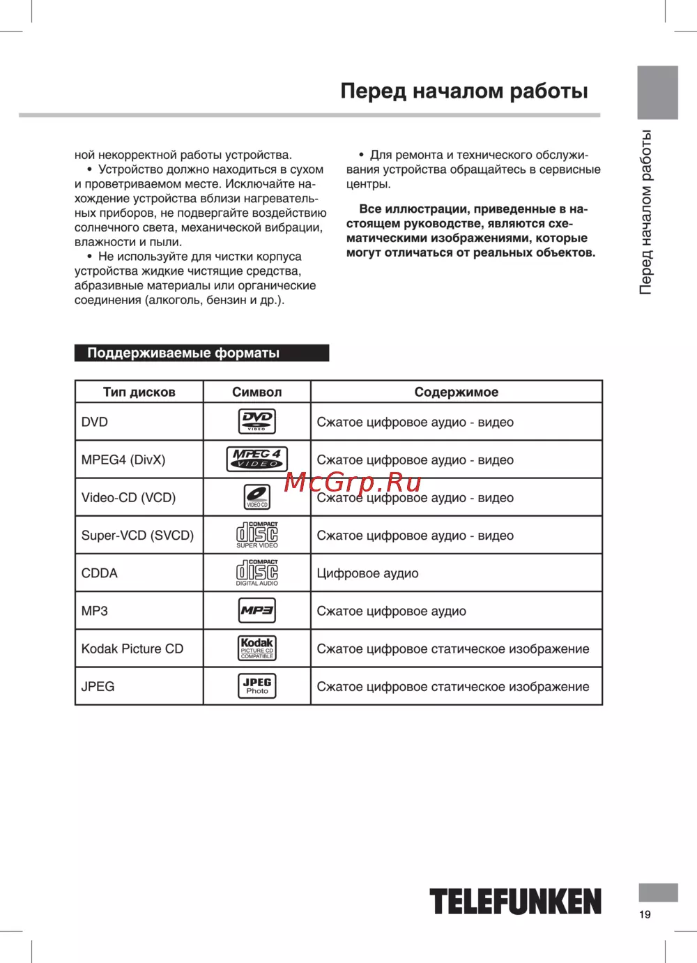 ной некорректной работы устройства Устройство должно находиться в сухом и проветриваемом месте Исключайте на хождение устройства вблизи нагреватель ных приборов не подвергайте воздействию солнечного света механической вибрации влажности и пыли Не используйте для чистки корпуса устройства жидкие чистящие средства абразивные материалы или органические соединения алкоголь бензин и др Для ремонта и технического обслужи вания устройства обращайтесь в сервисные центры Все иллюстрации приведенные в на стоящем руководстве являются схе матическими изображениями которые могут отличаться от реальных объектов Поддерживаемые форматы Тип дисков DVD MPEG4 DivX Символ оур ИНЕС 4 Video CD VCD Содержимое Сжатое цифровое аудио видео Сжатое цифровое аудио видео Сжатое цифровое аудио видео П COMPACT Super VCD SVCD Сжатое цифровое аудио видео SUPER VIDEO ПСОМРАСТ CDDA Цифровое аудио DIGITAL AUDIO MP3 Kodak Picture CD JPEG MP3 Kodak PICTURE CD COMPATIBLE JPEG Photo Сжатое цифровое аудио Сжатое цифровое статическое изображение Сжатое цифровое статическое изображение TELEFUNKEN Перед началом работы Перед началом работы