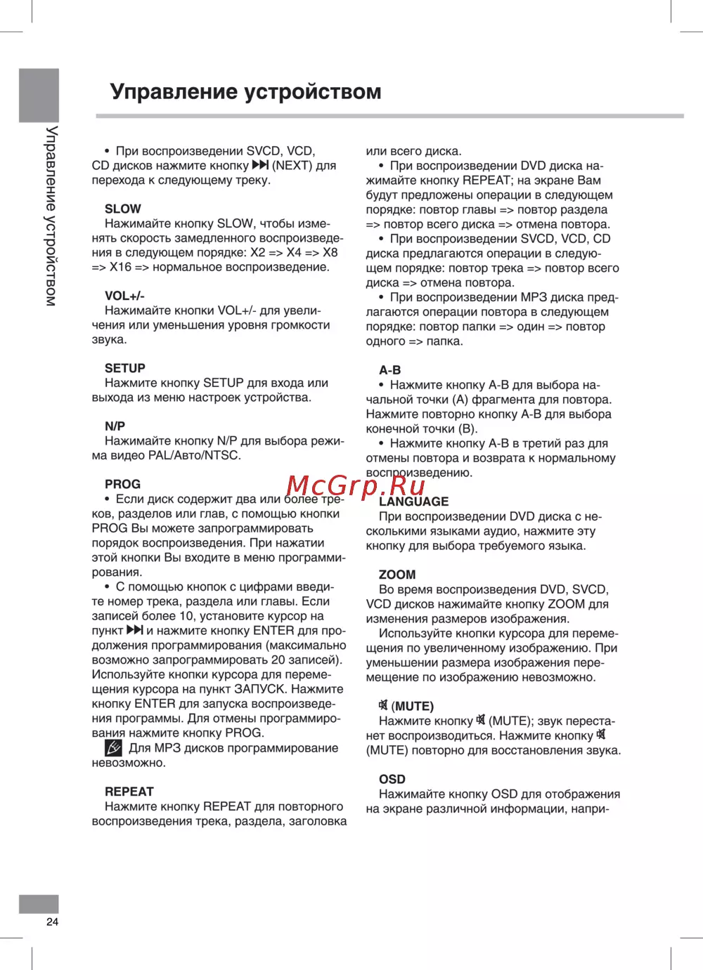 Управление устройством со ф Ф о I со о 2 При воспроизведении SVCD VCD CD дисков нажмите кнопку NEXT для перехода к следующему треку SLOW Нажимайте кнопку SLOW чтобы изме нять скорость замедленного воспроизведе ния в следующем порядке Х2 Х4 Х8 Х16 нормальное воспроизведение VOL Нажимайте кнопки VOL для увели чения или уменьшения уровня громкости звука SETUP Нажмите кнопку SETUP для входа или выхода из меню настроек устройства N P Нажимайте кнопку N P для выбора режи ма видео PAL ABTO NTSC PROG Если диск содержит два или более тре ков разделов или глав с помощью кнопки PROG Вы можете запрограммировать порядок воспроизведения При нажатии этой кнопки Вы входите в меню программи рования С помощью кнопок с цифрами введи те номер трека раздела или главы Если записей более 10 установите курсор на пункт и нажмите кнопку ENTER для про должения программирования максимально возможно запрограммировать 20 записей Используйте кнопки курсора для переме щения курсора на пункт ЗАПУСК Нажмите кнопку ENTER для запуска воспроизведе ния программы Для отмены программиро вания нажмите кнопку PROG Для MP3 дисков программирование невозможно REPEAT Нажмите кнопку REPEAT для повторного воспроизведения трека раздела заголовка 24 или всего диска При воспроизведении DVD диска на жимайте кнопку REPEAT на экране Вам будут предложены операции в следующем порядке повтор главы повтор раздела повтор всего диска отмена повтора При воспроизведении SVCD VCD CD диска предлагаются операции в следую щем порядке повтор трека повтор всего диска отмена повтора При воспроизведении MP3 диска пред лагаются операции повтора в следующем порядке повтор папки один повтор одного папка А В Нажмите кнопку A В для выбора на чальной точки А фрагмента для повтора Нажмите повторно кнопку A В для выбора конечной точки В Нажмите кнопку A В в третий раз для отмены повтора и возврата к нормальному воспроизведению LANGUAGE При воспроизведении DVD диска с не сколькими языками аудио нажмите эту кнопку для выбора требуемого языка ZOOM Во время воспроизведения DVD SVCD VCD дисков нажимайте кнопку ZOOM для изменения размеров изображения Используйте кнопки курсора для переме щения по увеличенному изображению При уменьшении размера изображения пере мещение по изображению невозможно Й MUTE Нажмите кнопку Й MUTE звук переста нет воспроизводиться Нажмите кнопку Й MUTE повторно для восстановления звука OSD Нажимайте кнопку OSD для отображения на экране различной информации напри