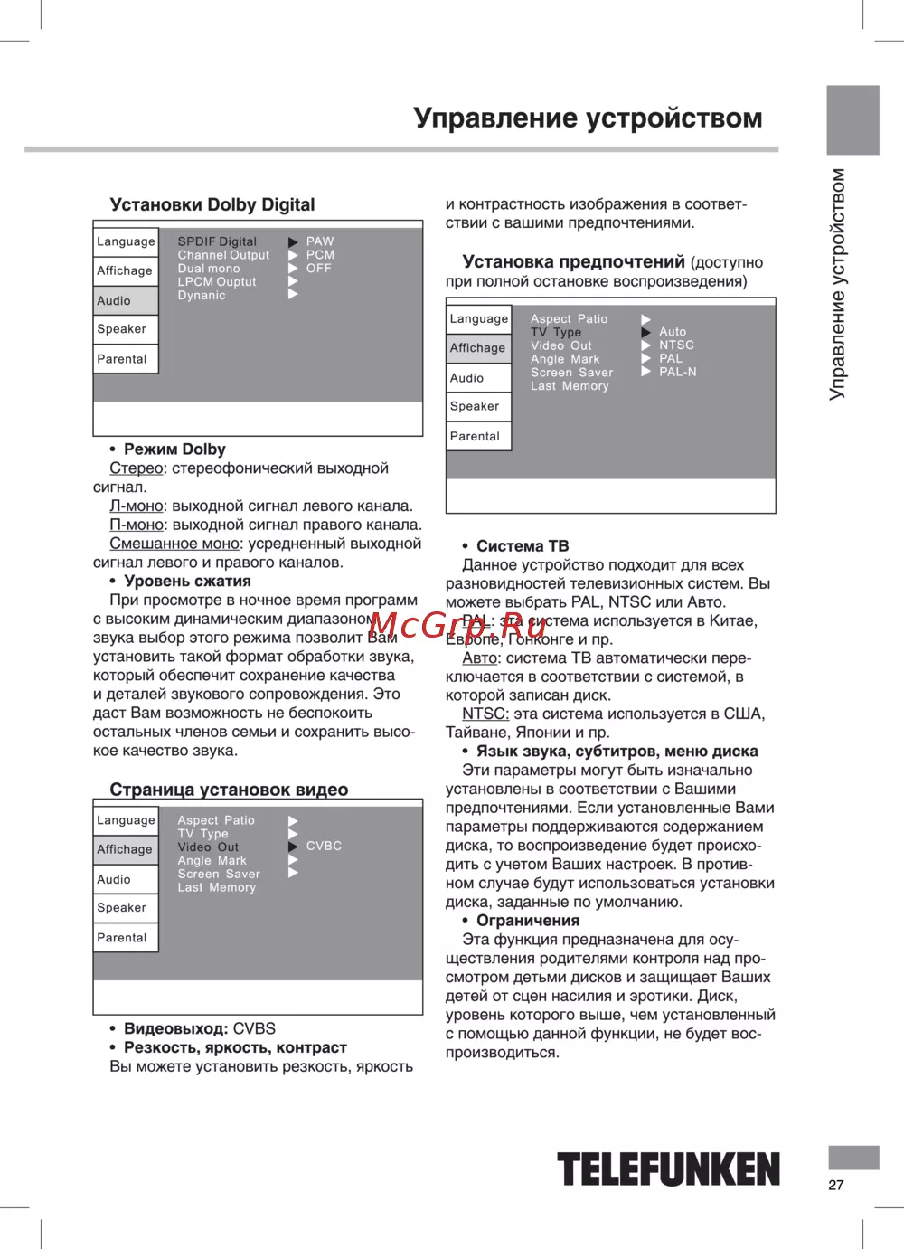 Установки Dolby Digital и контрастность изображения в соответ ствии с вашими предпочтениями Установка предпочтений доступно при полной остановке воспроизведения Режим Dolby Стерео стереофонический выходной сигнал Л моно выходной сигнал левого канала П моно выходной сигнал правого канала Смешанное моно усредненный выходной сигнал левого и правого каналов Уровень сжатия При просмотре в ночное время программ с высоким динамическим диапазоном звука выбор этого режима позволит Вам установить такой формат обработки звука который обеспечит сохранение качества и деталей звукового сопровождения Это даст Вам возможность не беспокоить остальных членов семьи и сохранить высо кое качество звука Резкость яркость контраст Вы можете установить резкость яркость Управление устройством Управление устройством Система ТВ Данное устройство подходит для всех разновидностей телевизионных систем Вы можете выбрать PAL NTSC или Авто PAL эта система используется в Китае Европе Гонконге и пр Авто система ТВ автоматически пере ключается в соответствии с системой в которой записан диск NTSC эта система используется в США Тайване Японии и пр Язык звука субтитров меню диска Эти параметры могут быть изначально установлены в соответствии с Вашими предпочтениями Если установленные Вами параметры поддерживаются содержанием диска то воспроизведение будет происхо дить с учетом Ваших настроек В против ном случае будут использоваться установки диска заданные по умолчанию Ограничения Эта функция предназначена для осу ществления родителями контроля над про смотром детьми дисков и защищает Ваших детей от сцен насилия и эротики Диск уровень которого выше чем установленный с помощью данной функции не будет вос производиться TELEFUNKEN 27