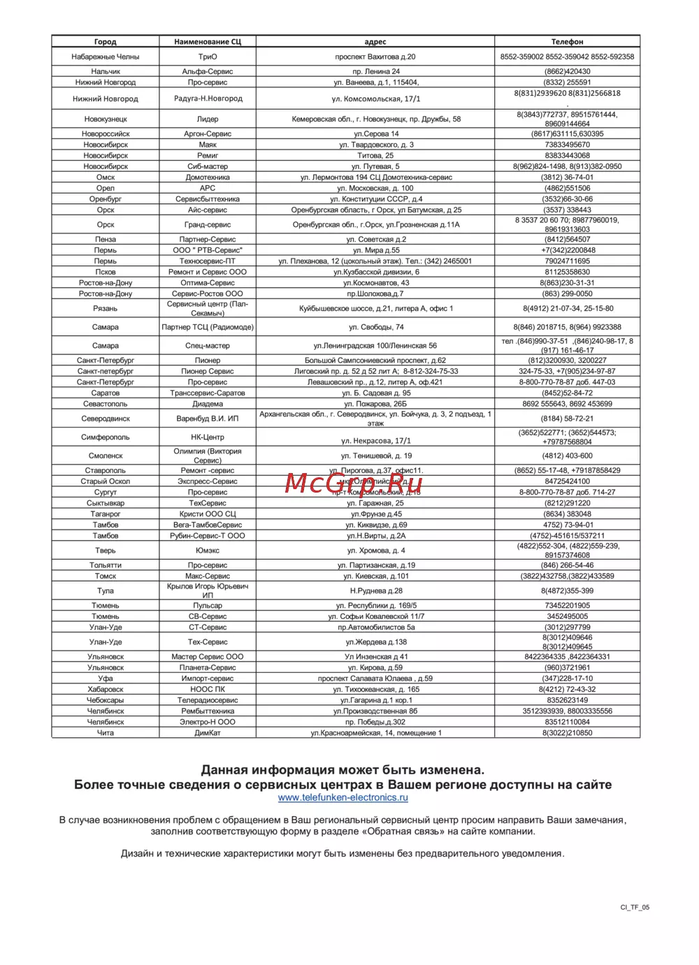 Город Наименование СЦ адрес Набережные Челны ТриО проспект Вахитова д 20 Нальчик Альфа Сервис пр Ленина 24 Нижний Новгород Про сервис ул Ванеева д 1 115404 Радуга Н Новгород ул Комсомольская 17 1 Новокузнецк Лидер Кемеровская обл г Новокузнецк пр Дружбы 58 Новороссийск Аргон Сервис ул Серова 14 Маяк ул Тбардовского д 3 Нижний Новгород Новосибирск Телефон 8552 359002 8552 359042 8552 592358 8662 420430 8332 255591 8 831 2939620 8 831 2566818 8 3843 772737 89515761444 89609144664 8617 631115 630395 73833495670 Новосибирск Ремиг Титова 25 83833443068 Новосибирск Сиб мастер ул Путевая 5 8 962 824 1498 8 913 382 0950 Омск Домотехн и ка ул Лермонтова 194 СЦ Домотехника сервис Орел АРС ул Московская д 100 4862 551506 Оренбург Сервисбыттехника ул Конституции СССР д 4 3532 66 30 66 Орск Айс сервис Оренбургская область г Орск ул Батумская д 25 Орск Гранд сервис Оренбургская обл г Орск ул Грозненская д 11 А Партнер Сервис ул Советская д 2 Пенза Пермь 3537 338443 8 3537 20 60 70 89877960019 89619313603 8412 564507 ул Мира д 55 7 342 2200848 Пермь Техносервис ПТ ул Плеханова 12 цокольный этаж Тел 342 2465001 79024711695 Псков Ремонт и Сервис ООО ул Кузбасской дивизии 6 81125358630 Ростов на Дону Оптима Сервис ул Космонавтов 43 8 863 230 31 31 Ростов на Дону Сервис Ростов ООО Сервисный центр ПалСекамыч пр Шолохова д 7 863 299 0050 Рязань ООО РТВ Сервис 3812 36 74 01 Самара Партнер ТСЦ Радиомоде Куйбышевское шоссе д 21 литера А офис 1 8 4912 21 07 34 25 15 80 ул Свободы 74 8 846 2018715 8 964 9923388 Самара Спец мастер ул Ленинградская 100 Ленинская 56 Санкт Петербург Пионер Большой Сампсониевский проспект д 62 тел 846 990 37 51 846 240 98 17 8 917 161 46 17 812 3200930 3200227 Санкт петербург Пионер Сервис Лиговский пр д 52 д 52 лит А 8 812 324 75 33 324 75 33 7 905 234 97 87 Санкт Петербург Про сервис Левашовский пр д 12 литер А оф 421 8 800 770 78 87 доб 447 03 Саратов Т ранссервис Саратов ул Б Садовая д 95 Севастополь Диадема Северодвинск Варенбуд В И ИП ул Пожарова 26Б Архангельская обл г Северодвинск ул Бойчука д 3 2 подъезд 1 этаж Симферополь НК Центр Смоленск Ставрополь Олимпия Виктория Сервис Ремонт сервис ул Некрасова 17 1 ул Тенишевой д 19 ул Пирогова д 37 офис11 8452 52 84 72 8692 555643 8692 453699 8184 58 72 21 3652 522771 3652 544573 79787568804 4812 403 600 8652 55 17 48 79187858429 Старый Оскол Экспресс Сервис мкр Олимпийский д 7 Сургут Про сервис пр т Комсомольский д 13 Сыктывкар ТехСервис ул Гаражная 25 8212 291220 Таганрог Кристи ООО СЦ ул Фрунзе д 45 8634 383048 Тамбов Вега Т амбовСервис ул Киквидзе д 69 4752 73 94 01 Т амбов Рубин Сервис Т ООО ул Н Вирты д 2А 4752 451615 537211 4822 552 304 4822 559 239 89157374608 846 266 54 46 84725424100 8 800 770 78 87 доб 714 27 Тверь Юмэкс ул Хромова д 4 Тольятти Про сервис ул Партизанская д 19 Томск ул Киевская д 101 Т юмень Макс Сервис Крылов Игорь Юрьевич ИП Пульсар ул Республики д 169 5 Т юмень СВ Сервис ул Софьи Ковалевской 11 7 3452495005 Улан Уде СТ Сервис пр Автомобилистов 5а 3012 297799 Тула Н Руднева д 28 3822 432758 3822 433589 8 4872 355 399 73452201905 8 3012 409646 8 3012 409645 8422364335 8422364331 Улан Уде Тех Сервис ул Жердева д 138 Ульяновск Мастер Сервис ООО Ул Инзенская д 41 Ульяновск Планета Сервис ул Кирова д 59 960 3721961 Уфа Импорт сервис проспект Салавата Юлаева д 59 347 228 17 10 ул Тихоокеанская д 165 Хабаровск НООС ПК Чебоксары Т елерадиосервис ул Гагарина д 1 кор 1 8352623149 Челябинск Рембыттехника ул Производственная 86 3512393939 88003335556 8 4212 72 43 32 Челябинск Электро Н ООО пр Победы д 302 83512110084 Чита ДимКат ул Красноармейская 14 помещение 1 8 3022 210850 Данная информация может быть изменена Более точные сведения о сервисных центрах в Вашем регионе доступны на сайте www telefunken electron cs ru В случае возникновения проблем с обращением в Ваш региональный сервисный центр просим напр