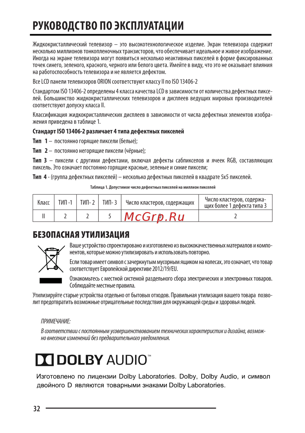 Все LCD панели телевизоров ORION соответствуют классу II по ISO 13406-2