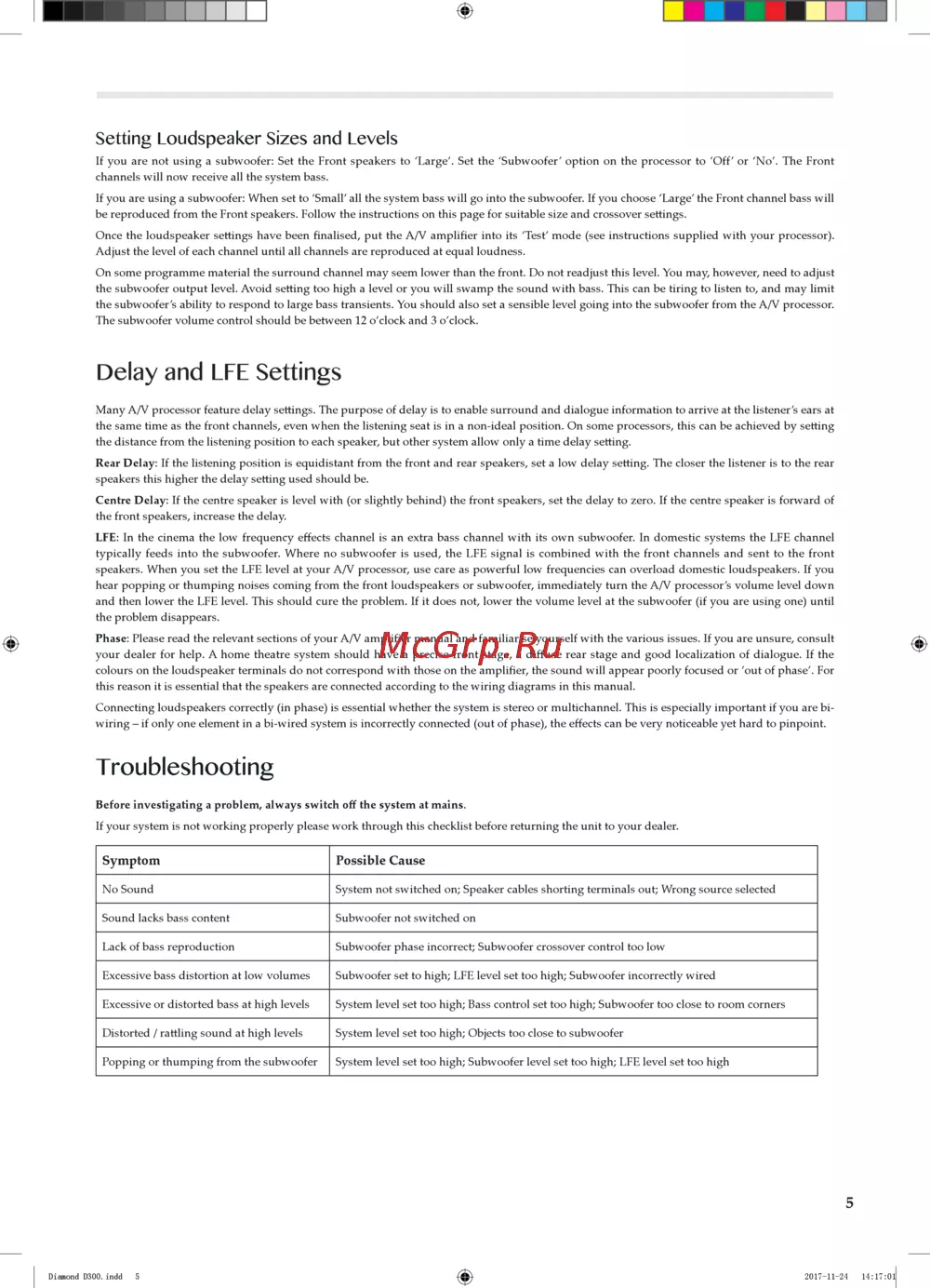 Setting Loudspeaker Sizes and Levels If you are not using a subwoofer Set the Front speakers to Large Set the Subwoofer option on the processor to Off or No The Front channels will now receive all the system bass If you are using a subwoofer When set to Small all the system bass will go into the subwoofer If you choose Large the Front channel bass will be reproduced from the Front speakers Follow the instructions on this page for suitable size and crossover settings Once the loudspeaker settings have been finalised put the A V amplifier into its Test mode see instructions supplied with your processor Adjust the level of each channel until all channels are reproduced at equal loudness On some programme material the surround channel may seem lower than the front Do not readjust this level You may however need to adjust the subwoofer output level Avoid setting too high a level or you will swamp the sound with bass This can be tiring to listen to and may limit the subwoofer s ability to respond to large bass transients You should also set a sensible level going into the subwoofer from the A V processor The subwoofer volume control should be between 12 o clock and 3 o clock Delay and LFE Settings Many A V processor feature delay settings The purpose of delay is to enable surround and dialogue information to arrive at the listener s ears at the same time as the front channels even when the listening seat is in a non ideal position On some processors this can be achieved by setting the distance from the listening position to each speaker but other system allow only a time delay setting Rear Delay If the listening position is equidistant from the front and rear speakers set a low delay setting The closer the listener is to the rear speakers this higher the delay setting used should be Centre Delay If the centre speaker is level with or slightly behind the front speakers set the delay to zero If the centre speaker is forward of the front speakers increase the delay LFE In the cinema the low frequency effects channel is an extra bass channel with its own subwoofer In domestic systems the LFE channel typically feeds into the subwoofer Where no subwoofer is used the LFE signal is combined with the front channels and sent to the front speakers When you set the LFE level at your A V processor use care as powerful low frequencies can overload domestic loudspeakers If you hear popping or thumping noises coming from the front loudspeakers or subwoofer immediately turn the A V processor s volume level down and then lower the LFE level This should cure the problem If it does not lower the volume level at the subwoofer if you are using one until the problem disappears Phase Please read the relevant sections of your A V amplifier manual and familiarise yourself with the various issues If you are unsure consult your dealer for help A home theatre system should have a precise front stage a diffuse rear stage and good localization of dialogue If the colours on the loudspeaker terminals do not correspond with those on the amplifier the sound will appear poorly focused or out of phase For this reason it is essential that the speakers are connected according to the wiring diagrams in this manual Connecting loudspeakers correctly in phase is essential whether the system is stereo or multichannel This is especially important if you are bi wiring if only one element in a bi wired system is incorrectly connected out of phase the effects can be very noticeable yet hard to pinpoint Troubleshooting Before investigating a problem always switch off the system at mains If your system is not working properly please work through this checklist before returning the unit to your dealer Symptom Possible Cause No Sound System not switched on Speaker cables shorting terminals out Wrong source selected Sound lacks bass content Subwoofer not switched on Lack of bass reproduction Subwoofer phase incorrect Subwoofer crossover control too low Excessive bass distortion at low volumes Subwoofer set to high LFE level set too high Subwoofer incorrectly wired Excessive or distorted bass at high levels System level set too high Bass control set too high Subwoofer too close to room corners Distorted rattling sound at high levels System level set too high Objects too close to subwoofer Popping or thumping from the subwoofer System level set too high Subwoofer level set too high LFE level set too high 5