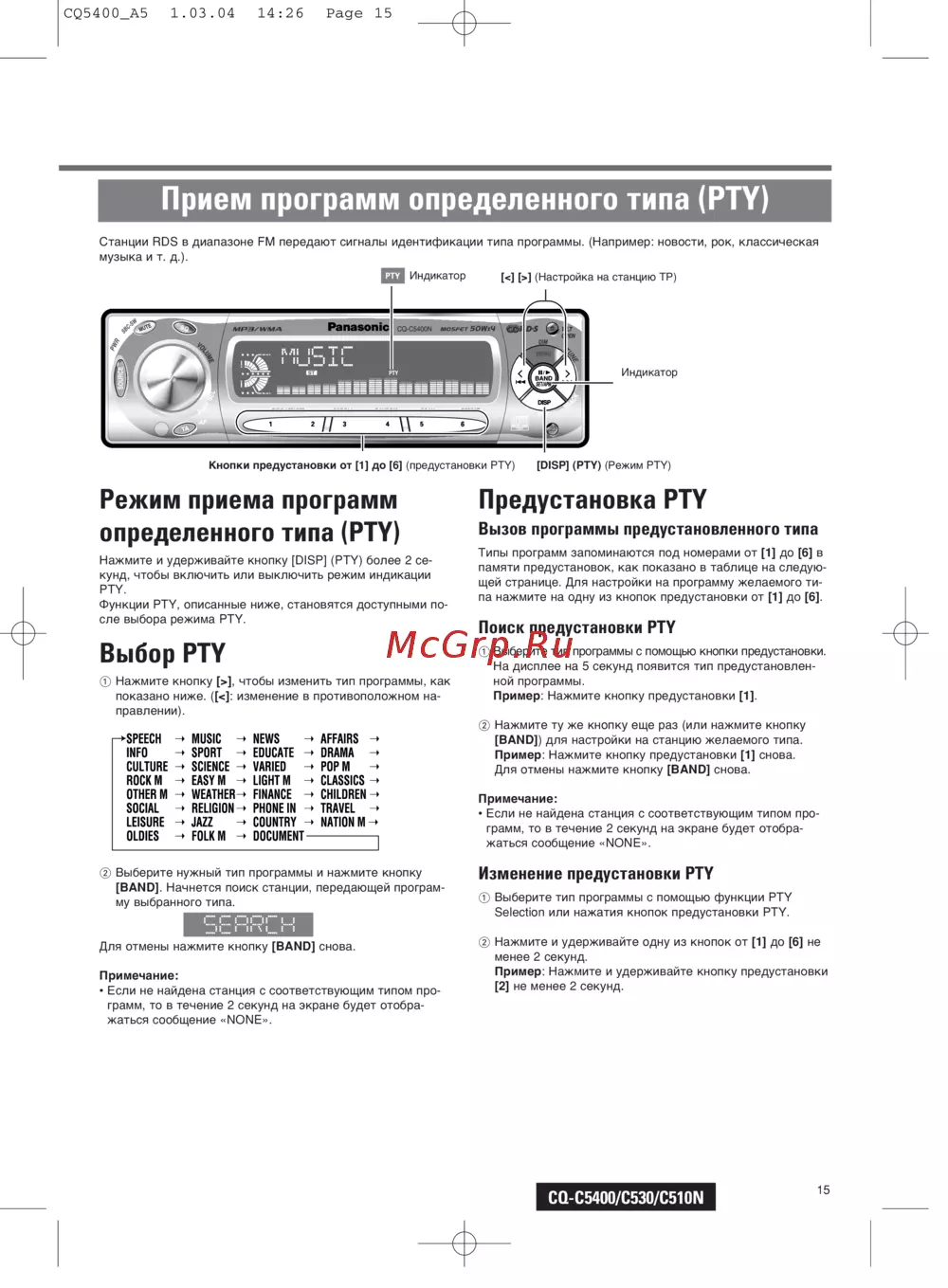 CQ5400_A5 1 03 04 14 26 Page 15 Прием программ определенного типа PTY Станции RDS в диапазоне FM передают сигналы идентификации типа программы Например новости рок классическая музыка и т д ЕЗ Индикатор Настройка на станцию ТР Индикатор Кнопки предустановки от 1 до 6 предустановки PTY DISP PTY Режим PTY Режим приема программ определенного типа РТУ Нажмите и удерживайте кнопку DISP PTY более 2 се кунд чтобы включить или выключить режим индикации PTY Функции PTY описанные ниже становятся доступными по сле выбора режима PTY Выбор РТУ Т Нажмите кнопку чтобы изменить тип программы как показано ниже изменение в противоположном на правлении r SPEECH MUSIC NEWS AFFAIRS INFO SPORT EDUCATE DRAMA CULTURE SCIENCE VARIED POPM ROCKM EASYM LIGHT M CLASSICS OTHER M WEATHER FINANCE CHILDREN SOCIAL RELIGION PHONE IN TRAVEL LEISURE JAZZ COUNTRY NATION M OLDIES FOLK M DOCUMENT 5 Выберите нужный тип программы и нажмите кнопку BAND Начнется поиск станции передающей програм му выбранного типа Для отмены нажмите кнопку BAND снова Примечание Если не найдена станция с соответствующим типом про грамм то в течение 2 секунд на экране будет отобра жаться сообщение NONE Предустановка РТУ Вызов программы предустановленного типа Типы программ запоминаются под номерами от 1 до 6 в памяти предустановок как показано в таблице на следую щей странице Для настройки на программу желаемого ти па нажмите на одну из кнопок предустановки от 1 до 6 Поиск предустановки PTY Т Выберите тип программы с помощью кнопки предустановки На дисплее на 5 секунд появится тип предустановлен ной программы Пример Нажмите кнопку предустановки 1 5 Нажмите ту же кнопку еще раз или нажмите кнопку BAND для настройки на станцию желаемого типа Пример Нажмите кнопку предустановки 1 снова Для отмены нажмите кнопку BAND снова Примечание Если не найдена станция с соответствующим типом про грамм то в течение 2 секунд на экране будет отобра жаться сообщение NONE Изменение предустановки PTY Т Выберите тип программы с помощью функции PTY Selection или нажатия кнопок предустановки PTY 5 Нажмите и удерживайте одну из кнопок от 1 до 6 не менее 2 секунд Пример Нажмите и удерживайте кнопку предустановки 2 не менее 2 секунд CQ C5400 C530 C510N 15