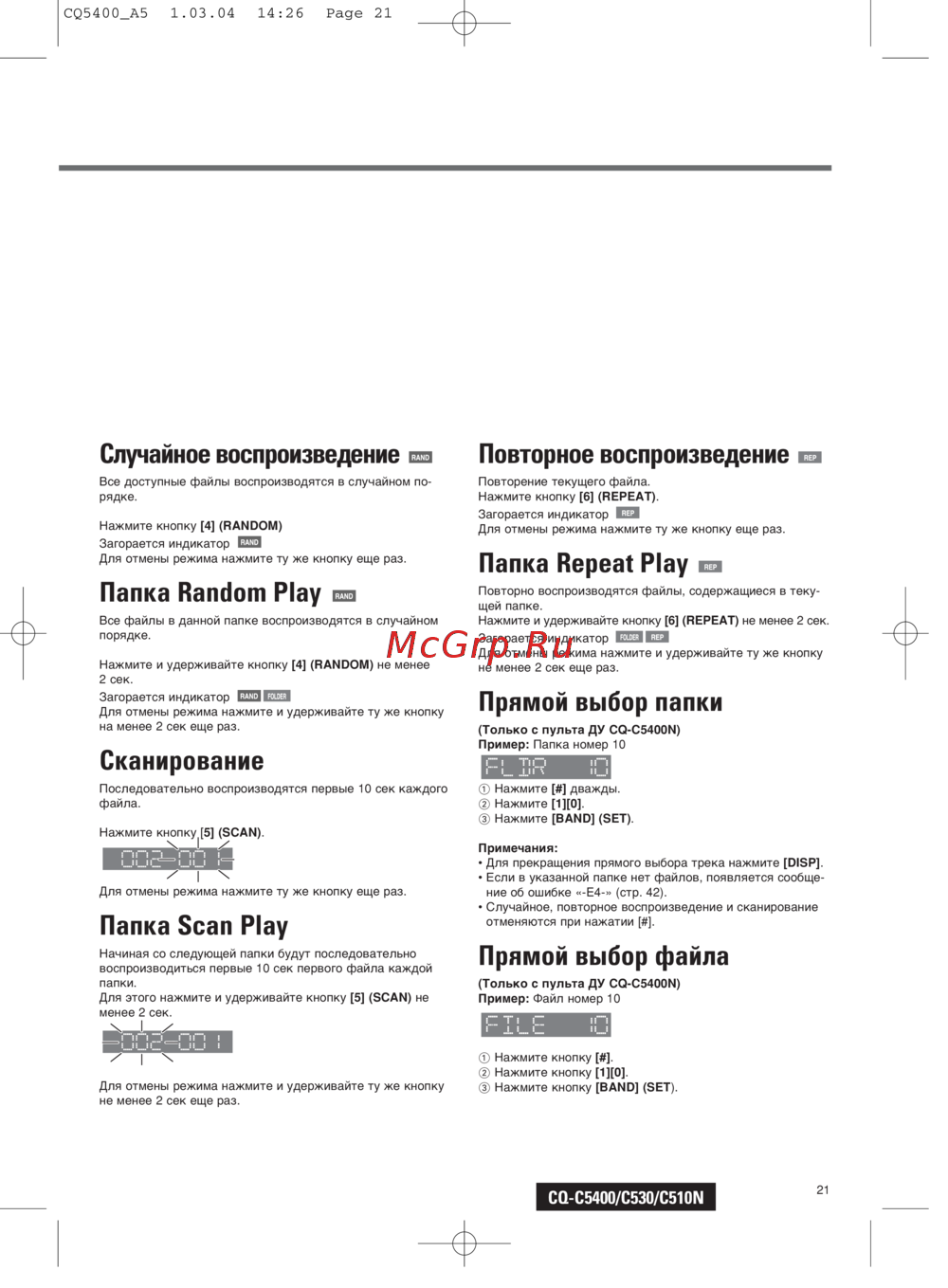 CQ5400_A5 1 03 04 14 26 Page 21 Случайное воспроизведение m Повторное воспроизведение а Все доступные файлы воспроизводятся в случайном по рядке Повторение текущего файла Нажмите кнопку 6 REPEAT Нажмите кнопку 4 RANDOM Загорается индикатор ILJ Для отмены режима нажмите ту же кнопку еще раз Загорается индикатор ЕШ Для отмены режима нажмите ту же кнопку еще раз Папка Random Play и Все файлы в данной папке воспроизводятся в случайном порядке Нажмите и удерживайте кнопку 4 RANDOM не менее 2 сек Загорается индикатор ULIL ii Для отмены режима нажмите и удерживайте ту же кнопку на менее 2 сек еще раз Сканирование Последовательно воспроизводятся первые 10 сек каждого файла Папка Repeat Play Q Повторно воспроизводятся файлы содержащиеся в теку щей папке Нажмите и удерживайте кнопку 6 REPEAT не менее 2 сек Загорается индикатор IZOd Для отмены режима нажмите и удерживайте ту же кнопку не менее 2 сек еще раз Прямой выбор папки Только с пульта ДУ CQ C5400N Пример Папка номер 10 Я БД 0 Т Нажмите дважды 5 Нажмите 1 0 з Нажмите BAND SET Нажмите кнопку 5 SCAN Для отмены режима нажмите ту же кнопку еще раз Папка Scan Play Начиная со следующей папки будут последовательно воспроизводиться первые 10 сек первого файла каждой папки Для этого нажмите и удерживайте кнопку 5 SCAN не менее 2 сек Для отмены режима нажмите и удерживайте ту же кнопку не менее 2 сек еще раз Примечания Для прекращения прямого выбора трека нажмите DISP Если в указанной папке нет файлов появляется сообще ние об ошибке Е4 стр 42 Случайное повторное воспроизведение и сканирование отменяются при нажатии Прямой выбор файла Только с пульта ДУ CQ C5400N Пример Файл номер 10 Т Нажмите кнопку 5 Нажмите кнопку 1 0 з Нажмите кнопку BAND SET CQ C5400 C530 C510N 21