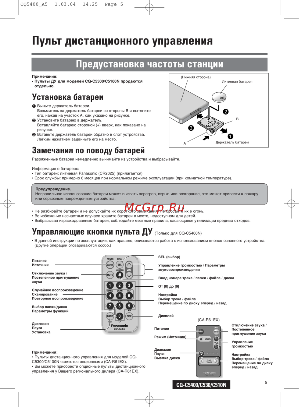 CQ5400_A5 1 03 04 14 25 Page 5 Пульт дистанционного управления Предустановка частоты станции Примечание Пульты ДУ для моделей CQ C5300 C5100N продаются отдельно Установка батареи О Выньте держатель батареи Возьмитесь за держатель батареи со стороны В и вытяните его нажав на участок А как указано на рисунке О Установите батарею в держатель Вставляйте батарею стороной вверх как показано на рисунке Вставьте держатель батареи обратно в слот устройства Легким нажатием задвиньте его на место Замечания по поводу батарей Разряженные батареи немедленно вынимайте из устройства и выбрасывайте Информация о батареях Тип батареи литиевая Panasonic CR2025 прилагается Срок службы примерно 6 месяцев при нормальном режиме эксплуатации при комнатной температуре Предупреждение Неправильное использование батареи может вызвать перегрев взрыв или возгорание что может привести к пожару или серьезным повреждениям устройства Не разбирайте батареи и не допускайте их короткого замыкания Не бросайте их в огонь Во избежание несчастных случаев храните батареи в месте недоступном для детей Выбрасывая израсходованные батареи соблюдайте местные правила касающиеся утилизации вредных отходов Управляющие кнопки пульта ДУ Только для СС С5400М В данной инструкции по эксплуатации как правило описывается работа с использованием кнопок основного устройства Другие операции оговариваются особо SEL выбор Питание Источник Отключение звука Постепенное приглушение Управление громкостью Параметры звуковоспроизведения _ Ввод номера трека папки файла диска звука От 0 до 9 Случайное воспроизведение Сканирование Повторное воспроизведение Настройка Выбор трека файла Перемещение подиску вперед назад Выбор папки диска Параметры функций Дисплей CA R61EX Диапазон Пауза Установка Отключение звука Постепенное приглушение звука Питание Режим Источник Управление громкостью Примечания Пульты дистанционного управления для моделей СОС5300 С5100М являются опционными СА Р61ЕХ Вы можете приобрести опционные пульты дистанционного управления у Вашего регионального дилера СА А61ЕХ Диапазон Пауза Выемка диска Настройка Выбор трека файла Перемещение подиску вперед назад CQ C5400 C530 C510N 5