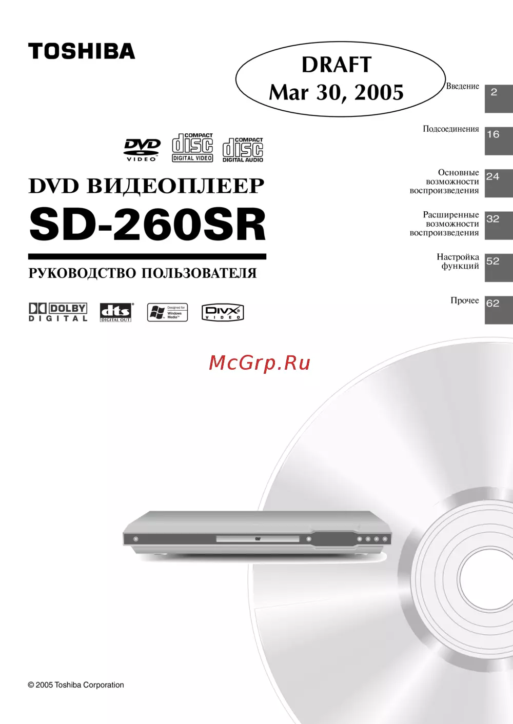 TOSHIBA Подсоединения ЙЕ ЙЕ VIDEO DIGITAL VIDEO oicTALAUOio DVD ВИДЕОПЛЕЕР SD 260SR РУКОВОДСТВО ПОЛЬЗОВАТЕЛЯ DIGITAL н 2005 Toshiba Corporation Основные возможности воспроизведения Расширенные возможности воспроизведения Настройка функций Прочее OlYXi VIоЕО