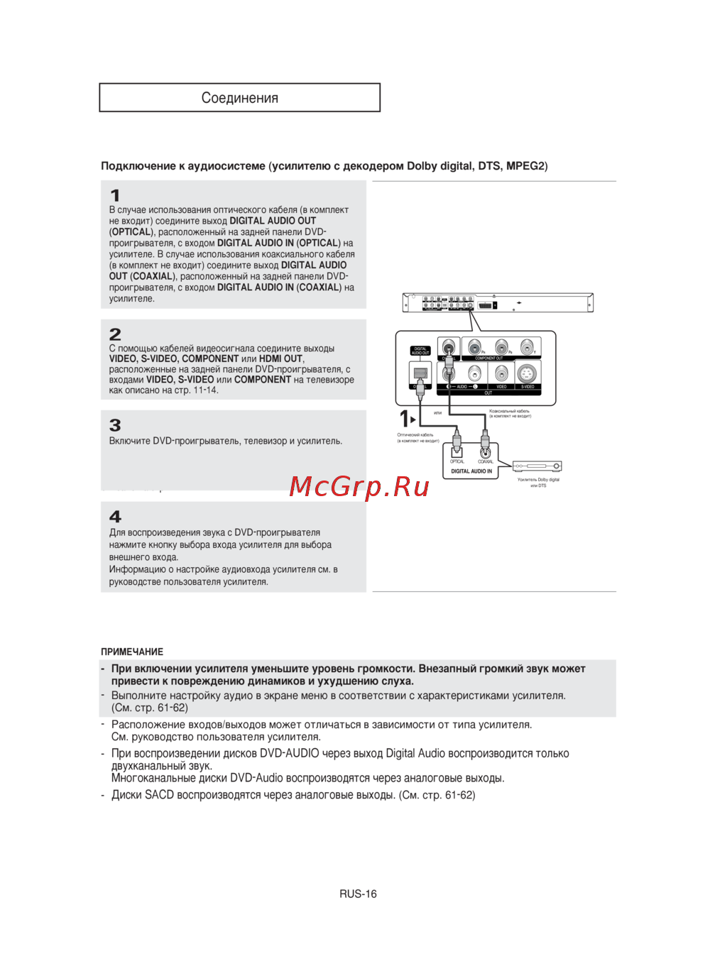Соединения Подключение к аудиосистеме усилителю с декодером Dolby digital DTS MPEG2 1 В случае использования оптического кабеля в комплект не входит соедините выход DIGITAL AUDIO OUT OPTICAL расположенный на задней панели DVDпроигрывателя с входом DIGITAL AUDIO IN OPTICAL на усилителе В случае использования коаксиального кабеля в комплект не входит соедините выход DIGITAL AUDIO OUT COAXIAL расположенный на задней панели DVDпроигрывателя с входом DIGITAL AUDIO IN COAXIAL на усилителе 2 С помощью кабелей видеосигнала соедините выходы VIDEO S VIDEO COMPONENT или HDMI OUT расположенные на задней панели DVD проигрывателя с входами VIDEO S VIDEO или COMPONENT на телевизоре какописано на стр 11 14 3 Включите DVD проигрыватель телевизор и усилитель 4 Для воспроизведения звука с ОУО проигрывателя нажмите кнопку выбора входа усилителя для выбора внешнего входа Информацию о настройке аудиовхода усилителя см в руководстве пользователя усилителя ПРИМЕЧАНИЕ При включении усилителя уменьшите уровень громкости Внезапный громкий звук может привести к повреждению динамиков и ухудшению слуха Выполните настройку аудио в экране меню в соответствии с характеристиками усилителя См стр 61 62 Расположение входов выходов может отличаться в зависимости от типа усилителя См руководство пользователя усилителя При воспроизведении дисков DVD AUDIO через выход Digital Audio воспроизводится только двухканальный звук Многоканальные диски DVD Audio воспроизводятся через аналоговые выходы Диски SACD воспроизводятся через аналоговые выходы См стр 61 62 RUS 16