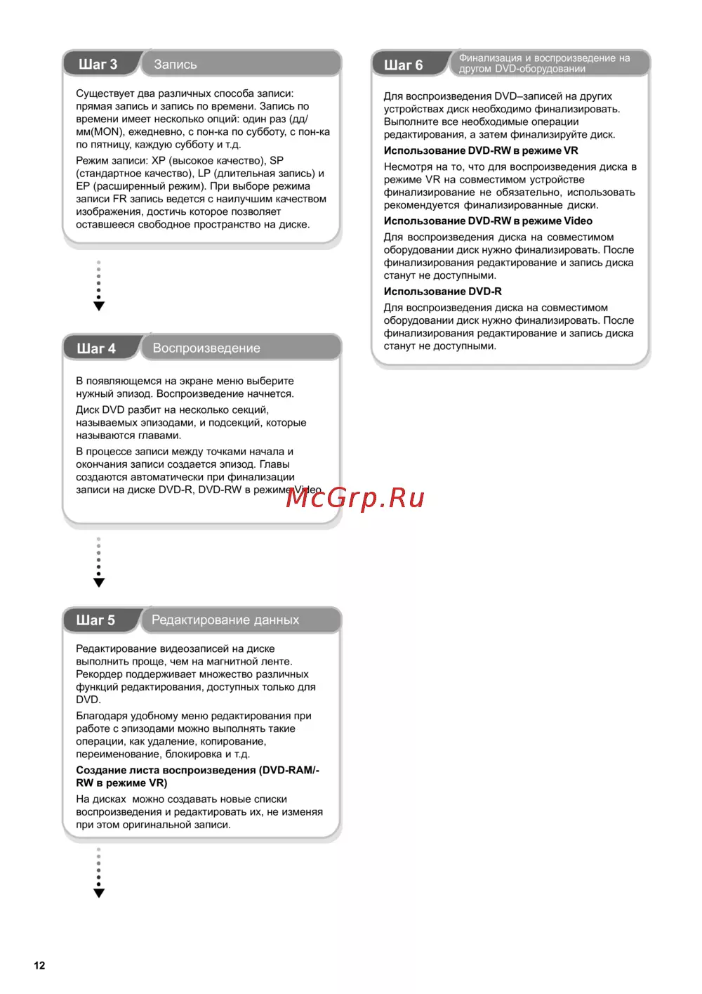 ШагЗ i Запись Существует два различных способа записи прямая запись и запись по времени Запись по времени имеет несколько опций один раз дд мм МОМ ежедневно спон ка по субботу с пон ка по пятницу каждую субботу и т д Режим записи ХР высокое качество ЭР стандартное качество ЬР длительная запись и ЕР расширенный режим При выборе режима записи РР запись ведется с наилучшим качеством изображения достичь которое позволяет оставшееся свободное пространство на диске _ Финализация и воспроизведение на Шаг о другом РУР оборудовании___________ Для воспроизведения DVD записей на других устройствах диск необходимо финализировать Выполните все необходимые операции редактирования а затем финализируйте диск Использование DVD RW в режиме VR Несмотря на то что для воспроизведения диска режиме VR на совместимом устройстве финализирование не обязательно использоват рекомендуется финализированные диски Использование DVD RW в режиме Video Для воспроизведения диска на совместимом оборудовании диск нужно финализировать Пос финализирования редактирование и запись дис станут не доступными Использование DVD R Шаг 4 х Воспроизведение В появляющемся на экране меню выберите нужный эпизод Воспроизведение начнется Диск DVD разбит на несколько секций называемых эпизодами и подсекций которые называются главами В процессе записи между точками начала и окончания записи создается эпизод Главы создаются автоматически при финализации записи на диске DVD R DVD RW в режиме Video Шаг 5 1 Редактирование данных Редактирование видеозаписей на диске выполнить проще чем на магнитной ленте Рекордер поддерживает множество различных функций редактирования доступных только для DVD Благодаря удобному меню редактирования при работе с эпизодами можно выполнять такие операции как удаление копирование переименование блокировка и т д Создание листа воспроизведения DVD RAM RW в режиме VR На дисках можно создавать новые списки воспроизведения и редактировать их не изменяя при этом оригинальной записи 12 Для воспроизведения диска на совместимом оборудовании диск нужно финализировать Пос финализирования редактирование и запись дис станут не доступными