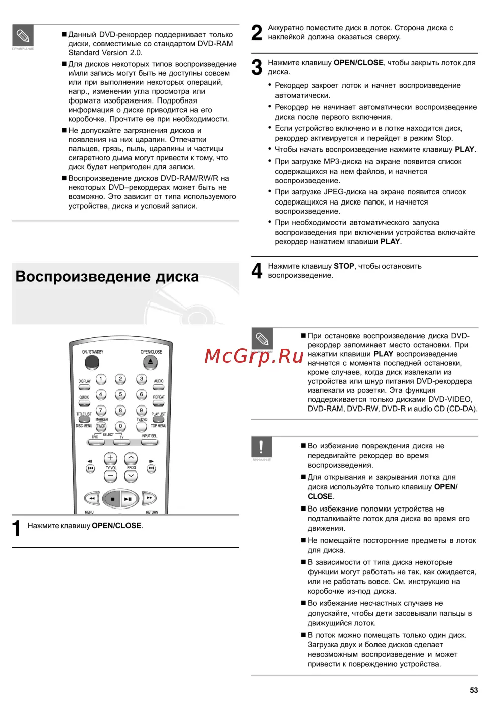 Данный DVD рекордер поддерживает только диски совместимые со стандартом DVD RAM Standard Version 2 0 Для дисков некоторых типов воспроизведение и или запись могут быть не доступны совсем или при выполнении некоторых операций напр изменении угла просмотра или формата изображения Подробная информация о диске приводится на его коробочке Прочтите ее при необходимости 2 Аккуратно поместите диск в лоток Сторона диска наклейкой должна оказаться сверху 3 Нажмите клавишу OPEN CLOSE чтобы закрыть ло диска Рекордер закроет лоток и начнет воспроизведен автоматически Рекордер не начинает автоматически воспроизв диска после первого включения Если устройство включено и в лотке находится рекордер активируется и перейдет в режим S Не допускайте загрязнения дисков и появления на них царапин Отпечатки пальцев грязь пыль царапины и частицы сигаретного дыма могут привести к тому что диск будет непригоден для записи Чтобы начать воспроизведение нажмите клавиш При загрузке МРЗ диска на экране появится спис содержащихся на нем файлов и начнется воспроизведение Воспроизведение дисков DVD RAM RW R на некоторых DVD рекордерах может быть не возможно Это зависит от типа используемого устройства диска и условий записи При загрузке JPEG диска на экране появится спи содержащихся на диске папок и начнется воспроизведение При необходимости автоматического запуска воспроизведения при включении устройства вкл рекордер нажатием клавиши PLAY Воспроизведение диска 4 Нажмите клавишу STOP чтобы остановить восп рои зведение При остановке воспроизведение диска рекордер запоминает место остановки нажатии клавиши PLAY воспроизведе начнется с момента последней остано кроме случаев когда диск извлекали и устройства или шнур питания DVD ре извлекали из розетки Эта функция поддерживается только дисками DVD DVD RAM DVD RW DVD R и audio C Во избежание повреждения диска не передвигайте рекордер во время воспроизведения Для открывания и закрывания лотка д диска используйте только клавишу OP CLOSE Нажмите клавишу OPEN CLOSE Во избежание поломки устройства не подталкивайте лоток для диска во вре движения Не помещайте посторонние предметы для диска В зависимости от типа диска некоторы функции могут работать не так как ож или не работать вовсе См инструкци коробочке из под диска Во избежание несчастных случаев не допускайте чтобы дети засовывали п движущийся лоток В лоток можно помещать только один Загрузка двух и более дисков сделает невозможным воспроизведение и мож привести к повреждению устройства