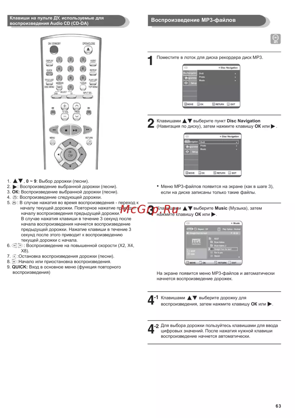 Клавиши на пульте ДУ используемые для воспроизведения Audio CD CD DA Воспроизведение МРЗ файлов Поместите в лоток для диска рекордера диск MP3 Клавишами АТ выберите пункт Disc Navigation Навигация по диску затем нажмите клавишу ОК 2 1 АТ 0 9 Выбор дорожки песни 2 Воспроизведение выбранной дорожки песни 3 ОК Воспроизведение выбранной дорожки песни 4 Воспроизведение следующей дорожки 5 В случае нажатия во время воспроизведения переход к началу текущей дорожки Повторное нажатие приводит к началу воспроизведения предыдущей дорожки В случае нажатия клавиши в течение 3 секунд после начала воспроизведения начнется воспроизведение предыдущей дорожки Нажатие клавиши в течение 3 секунд после этого приводит к воспроизведению текущей дорожки с начала Воспроизведение на повышенной скорости Х2 Х4 Х8 7 О Остановка воспроизведения дорожки песни 8 3 Начало или приостановка воспроизведения 9 QUICK Вход в основное меню функция повторного воспроизведения Меню МРЗ файлов появится на экране как в если на диске записаны только такие файлы О Клавишами АТ выберите Music Музыка зат нажмите клавишу ОК или СО______________________________________ Music Щ MOVE ОК RE1URH ДЕ Т J На экране появится меню МРЗ файлов и автом начнется воспроизведение дорожек 1 Клавишами АТ выберите дорожку для воспроизведения затем нажмите клавишу ОК и 4 2 Для выбора дорожки пользуйтесь клавишами дл цифровых значений После нажатия нужной кла воспроизведение начнется автоматически 4