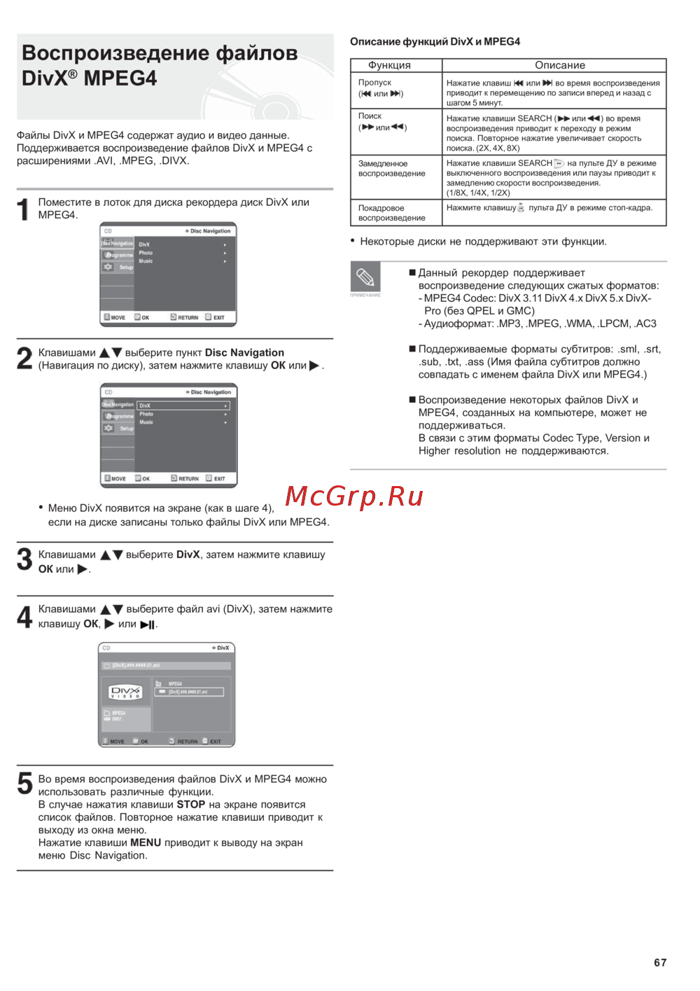 Воспроизведение файлов DivX MPEG4 Описание функций DivX и MPEG4 Функция Описание Пропуск Нажатие клавиш или во время воспроизведения М или Н приводит к перемещению по записи вперед и назад с шагом 5 минут Файлы DivX и MPEG4 содержат аудио и видео данные Поддерживается воспроизведение файлов DivX и MPEG4 с расширениями AVI MPEG DIVX Поиск Нажатие клавиши SEARCH или во время или воспроизведения приводит к переходу в режим поиска Повторное нажатие увеличивает скорость поиска 2Х 4Х 8Х Замедленное Нажатие клавиши SEARCH J на пульте ДУ в режиме воспроизведение выключенного воспроизведения или паузы приводит к замедлению скорости воспроизведения 1 8Х 1 4Х 1 2Х Поместите в лоток для диска рекордера диск DivX или МРЕС4 Покадровое Нажмите клавишу пульта ДУ в режиме стоп кадра воспроизведение Некоторые диски не поддерживают эти функции Данный рекордер поддерживает воспроизведение следующих сжатых фо MPEG4 Codec DivX 3 11 DivX 4 x DivX Рго без QPEL и GMC Аудиоформат MP3 MPEG WMA LP 2 Клавишами АТ выберите пункт Disc Navigation Навигация по диску затем нажмите клавишу ОК или Поддерживаемые форматы субтитров sub txt ass Имя файла субтитров дол совпадать с именем файла DivX или MP Воспроизведение некоторых файлов Div MPEG4 созданных на компьютере мож поддерживаться В связи с этим форматы Codec Type Ve Higher resolution не поддерживаются Меню DivX появится на экране как в шаге 4 если на диске записаны только файлы DivX или МРЕС4 3 Клавишами АТ выберите DivX затем нажмите клавишу ОК или 4 Клавишами АТ выберите файл avi DivX затем нажмите клавишу ОК или HI 5 Во время воспроизведения файлов DivX и MPEG4 можно использовать различные функции В случае нажатия клавиши STOP на экране появится список файлов Повторное нажатие клавиши приводит к выходу из окна меню Нажатие клавиши MENU приводит к выводу на экран меню Disc Navigation