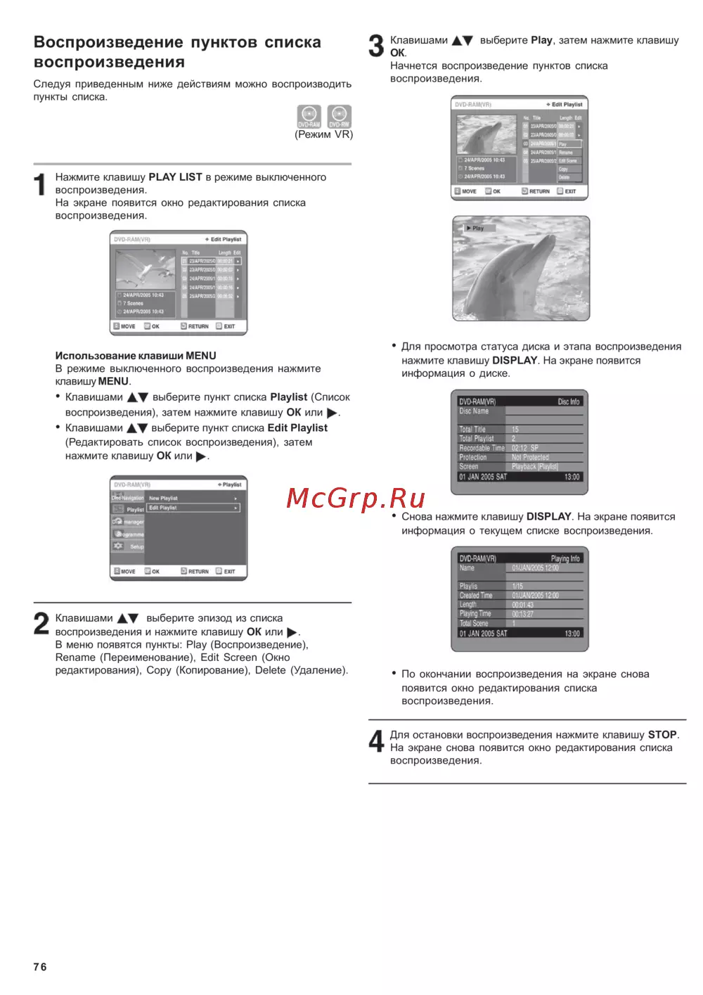 Воспроизведение пунктов списка воспроизведения Следуя приведенным ниже действиям можно воспроизводить пункты списка О Клавишами АТ выберите Play затем нажмите кл О ОК Начнется воспроизведение пунктов списка воспроизведения РУР ЯДМ УЯ ________________________у Edit Playlist Режим VR РОЦ 4 Нажмите клавишу PLAY LIST в режиме выключенного воспроизведения На экране появится окно редактирования списка воспроизведения Q MOVE ЕДОК Н RETURN EXIT J РУР ЯДМ УЯ ________________________ Edit Playlist В MOVE Д OK Н RETURN EXIT Использование клавиши MENU В режиме выключенного воспроизведения нажмите клавишу MENU Для просмотра статуса диска и этапа воспро нажмите клавишу DISPLAY На экране появи информация о диске Клавишами АТ выберите пункт списка Playlist Список воспроизведения затем нажмите клавишу ОК или Клавишами АТ выберите пункт списка Edit Playlist Редактировать список воспроизведения затем нажмите клавишу ОК или a Playlist I Снова нажмите клавишу DISPLAY На экране информация о текущем списке воспроизвед В MOVE ДОК И RETURN EXIT О Клавишами АТ выберите эпизод из списка воспроизведения и нажмите клавишу ОК или В меню появятся пункты Play Воспроизведение Rename Переименование Edit Screen Окно редактирования Сору Копирование Delete Удаление _________________________________ По окончании воспроизведения на экране сн появится окно редактирования списка воспроизведения Л Для остановки воспроизведения нажмите к Т На экране снова появится окно редактирования воспроизведения 76