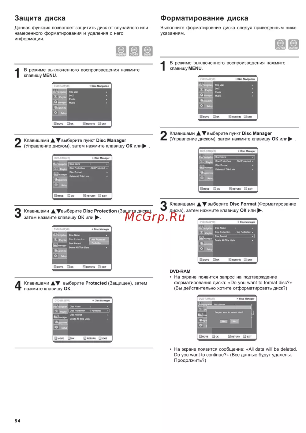 Защита диска Форматирование диска Данная функция позволяет защитить диск от случайного или намеренного форматирования и удаления с него информации Выполните форматировние диска следуя приведен указаниям В режиме выключенного воспроизведения наж клавишуМЕМи В режиме выключенного воспроизведения нажмите клавишуМЕМи 2 Клавишами АТвыберите пункт Disc Manager Управление диском затем нажмите клавишу ОК или О Клавишами АТвыберите Disc Protection Защита диска затем нажмите клавишу ОК или 4 Клавишами АТ выберите Protected Защищен затем нажмите клавишу ОК 2 Клавишами АТ выберите пункт Disc Manager Управление диском затем нажмите клавишу 3 Клавишами АТвыберите Disc Format Формати диска затем нажмите клавишу ОК или DVD RAM На экране появится запрос на подтверждение форматирования диска Do you want to form Вы действительно хотите отформатировать OVO RAM VR В MOVE 2 OK Disc Manager H RETURN EXIT На экране появится сообщение All data will b Do you want to continue Все данные будут Продолжить 84