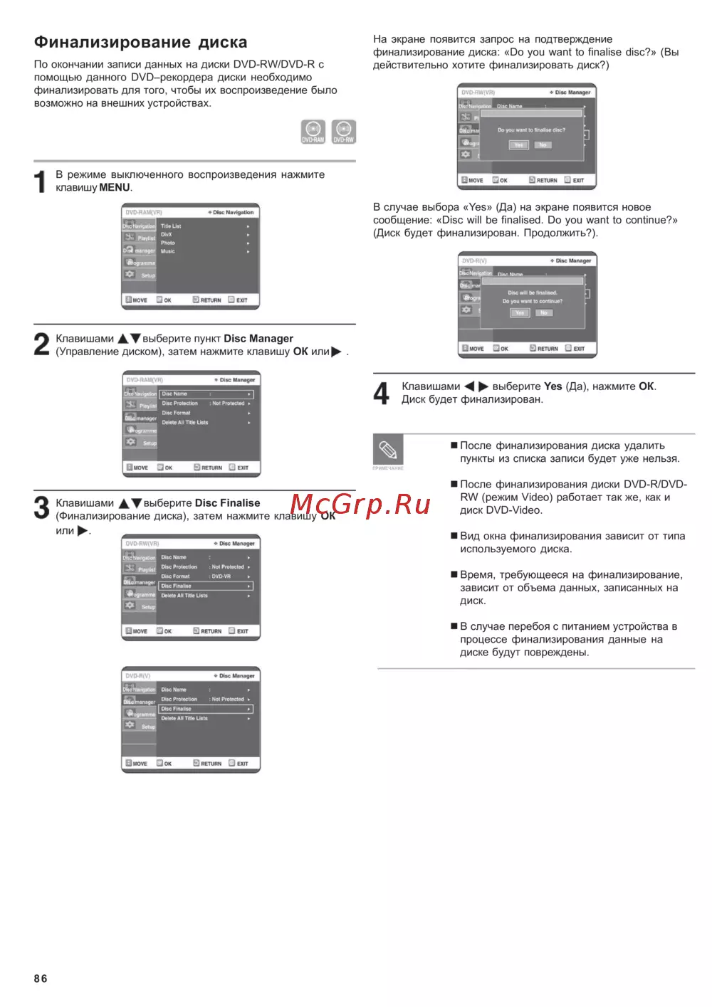 Финализирование диска По окончании записи данных на диски D D RW DVD R с помощью данного ОУО рекордера диски необходимо финализировать для того чтобы их воспроизведение было возможно на внешних устройствах На экране появится запрос на подтверждение финализирование диска Do you want to finalise dis действительно хотите финализировать диск В режиме выключенного воспроизведения нажмите клавишуМЕМи 1 2 В случае выбора Yes Да на экране появится но сообщение Disc will be finalised Do you want to co Диск будет финализирован Продолжить Клавишами АТвыберите пункт Disc Manager Управление диском затем нажмите клавишу ОК или 4 Клавишами выберите Yes Да нажмите Диск будет финализирован После финализирования диска у пункты из списка записи будет уж 3 Клавишами АТ выберите Disc Finalise Финализирование диска затем нажмите клавишу ОК или После финализирования диски D RW режим Video работает так ж диск DVD Video Вид окна финализирования зави используемого диска Время требующееся на финализ зависит от объема данных запис диск В случае перебоя с питанием уст процессе финализирования данн диске будут повреждены 86