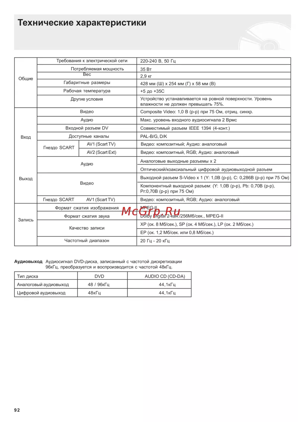 Технические характеристики Требования к электрической сети Потребляемая мощность Вес Общие 220 240 В 50 Гц 35 Вт 2 9 кг Габаритные размеры 428 мм Ш х 254 мм Г х 58 мм В Рабочая температура 5 до 35С Другие условия Видео Composite Video 1 0 В р р при 75 Ом отриц синхр Аудио Макс уровень входного аудиосигнала 2 Врмс Входной разъем 0 Доступные каналы Вход Гнездо SCART Устройство устанавливается на ровной поверхности Урове влажности не должен превышать 75 Совместимый разъем IEEE 1394 4 конт PAL B G D K AV1 ScartTV Видео композитный Аудио аналоговый AV2 Scart Ext Видео композитный RGB Аудио аналоговый Аналоговые выходные разъемы х 2 Аудио Оптический коаксиальный цифровой аудиовыходной разъе Выходной разъем S Video х 1 Y 1 0В р р С 0 286В р р Выход Видео Гнездо SCART Компонентный выходной разъем Y 1 0В р р РЬ 0 70В Рг 0 70В р р при 75 Ом AV1 ScartTV Формат сжатия изображения Запись Формат сжатия звука Качество записи Видео композитный RGB Аудио аналоговый MPEG II Dolby Digital 2 кан 256Мб сек MPEG II ХР ок 8 Мб сек SP ок 4 Мб сек LP ок 2 Мб сек ЕР ок 1 2 Мб сек или 0 8 Мб сек Частотный диапазон 20 Гц 20 кГц Аудиовыход Аудиосигнал ОУО диска записанный с частотой дискретизации 96кГц преобразуется и воспроизводится с частотой 48кГц Тип диска DVD AUDIO CD CD DA Аналоговый аудиовыход 48 96кГц 44 1 кГц Цифровой аудиовыход 48кГц 44 1 кГц 92