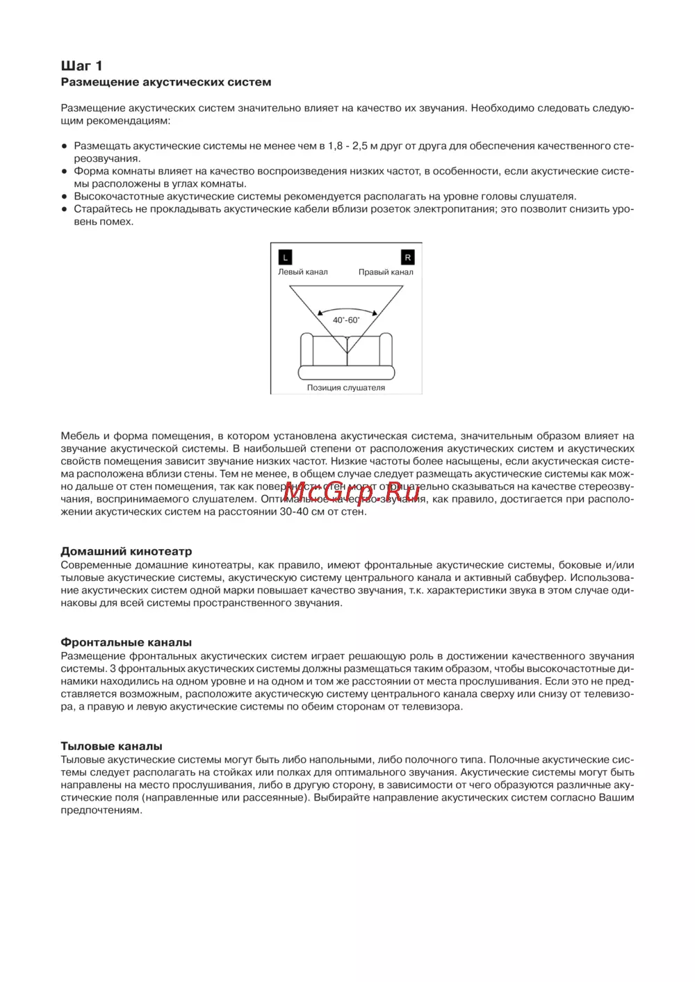 Размещать акустические системы не менее чем в 1,8 % 2,5 м друг от друга для обеспечения качественного сте%