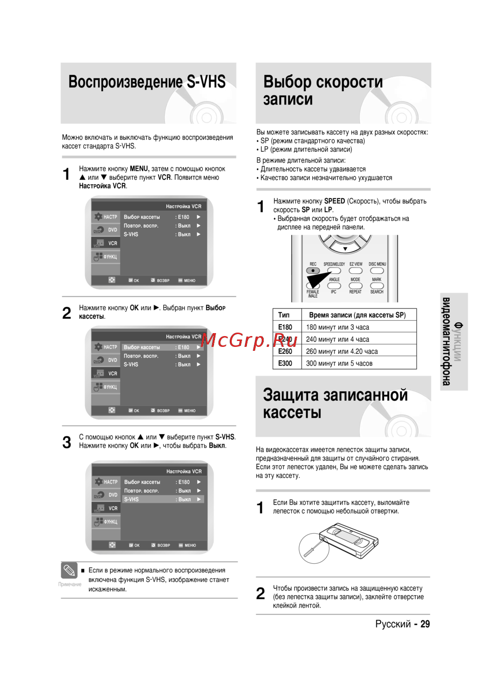 Воспроизведение S VHS Выбор скорости записи Вы можете записывать кассету на двух разных скоростях Можно включать и выключать функцию воспроизведения кассет стандарта S VHS ЗР режим стандартного качества ЬР режим длительной записи В режиме длительной записи Нажмите кнопку MENU затем с помощью кнопок или выберите пункт VCR Появится меню Длительность кассеты удваивается Качество записи незначительно ухудшается Настройка VCR Нажмите кнопку SPEED Скорость чтобы выбрать скорость SP или LP Выбранная скорость будет отображаться на дисплее на передней панели Нажмите кнопку ОК или Выбран пункт Выбор Тип кассеты Время записи для кассеты SP Е180 180 минут или 3 часа Е240 240 минут или 4 часа Е260 260 минут или 4 20 часа Е300 300 минут или 5 часов Защита записанной кассеты З С помощью кнопок или выберите пункт З УНЗ Нажмите кнопку ОК или чтобы выбрать Выкл На видеокассетах имеется лепесток защиты записи предназначенный для защиты от случайного стирания Настройка VCR Выбор кассеты Е180 ПОВТОР ВОСПР Выкл S VHS Выкл Если этот лепесток удален Вы не можете сделать запись на эту кассету Если Вы хотите защитить кассету выломайте vcS VCR лепесток с помощью небольшой отвертки В ОК О ВОЗВР во МЕНЮ Если в режиме нормального воспроизведения включена функция З УНЗ изображение станет искаженным 2 Чтобы произвести запись на защищенную кассету без лепестка защиты записи заклейте отверстие клейкой лентой Русский 29 Ф видеомагнитофона 2