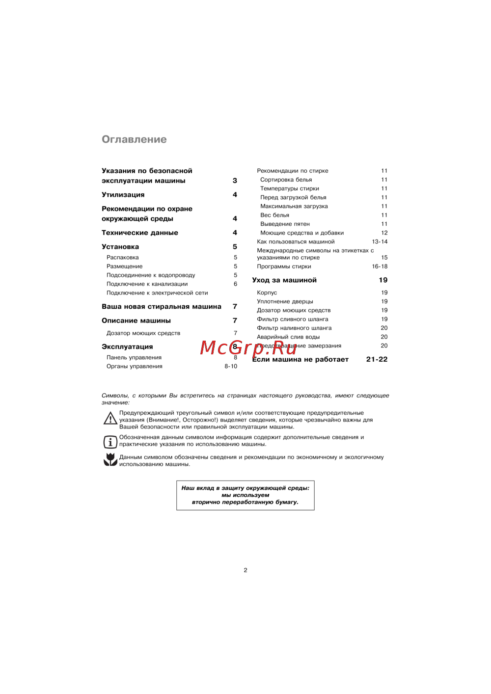 - Мы просим вас внимательно ознакомиться с данным руководством уделив особое внимание нижеприведенным правилам техники безопасности рекомендуем вам сохранить данное руководство для пользования им в будущем а также передать его новому владельцу в случае продажи машины следующие указания приведены в интересах общей безопасности вы должны внимательно ознакомиться с ними перед тем как приступить к установке и эксплуатации машины p.3