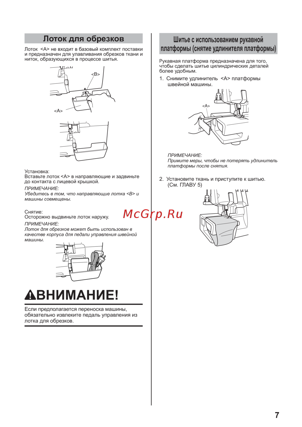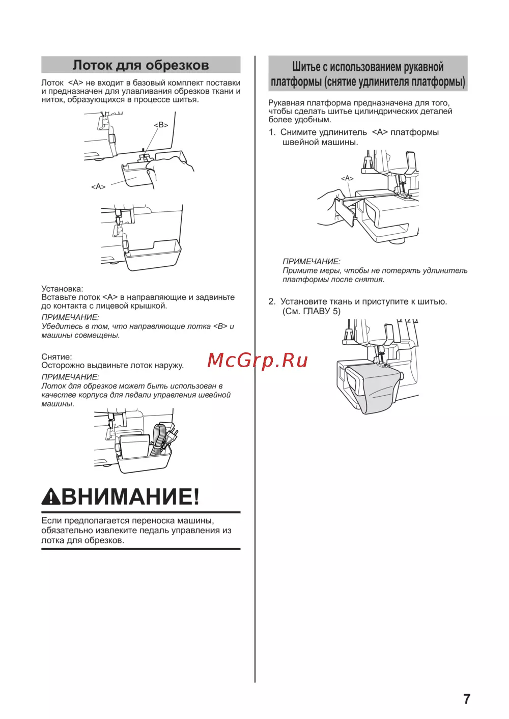 Узнайте, как использовать лоток для обрезков и рукавную платформу для удобного шитья. Подробные инструкции по установке и снятию аксессуаров.