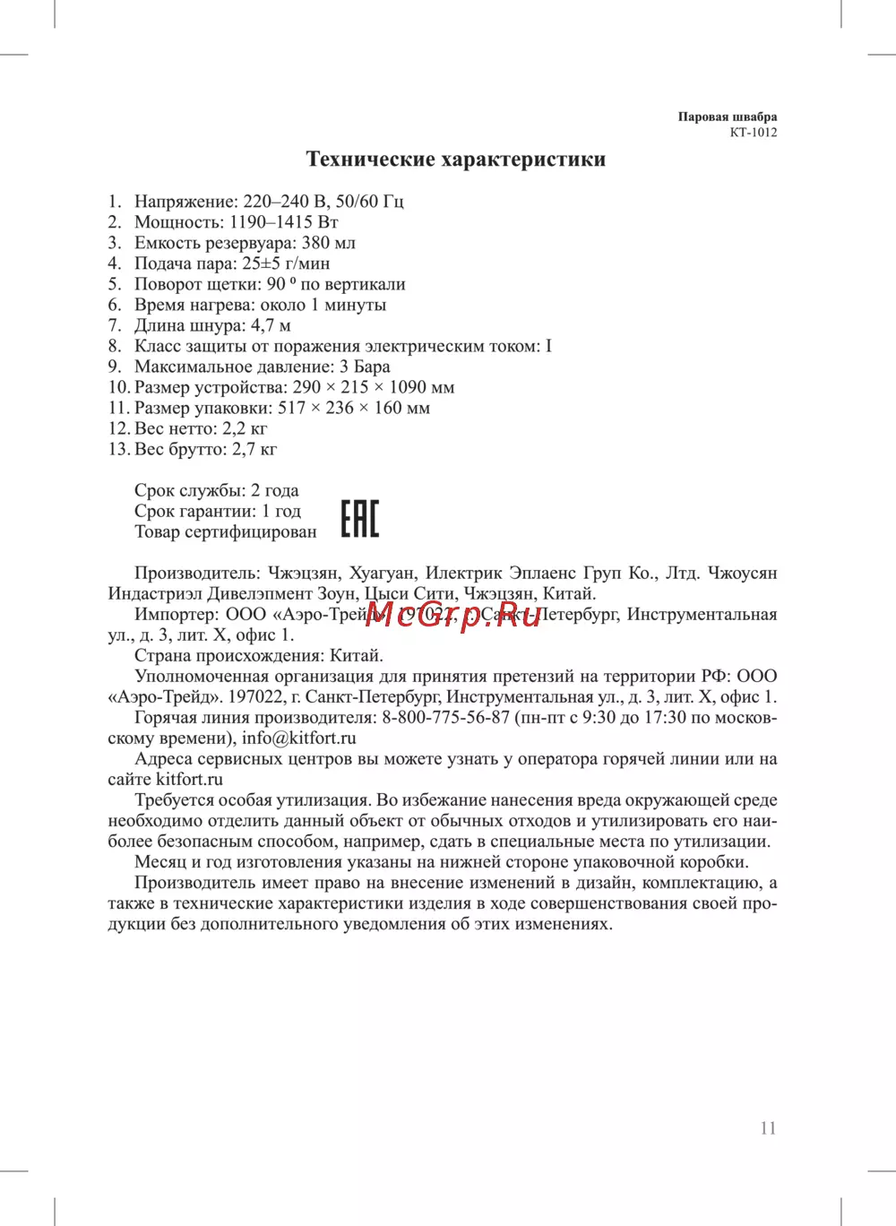 Паровая швабра КТ 1012 Технические характеристики 1 Напряжение 220 240 В 50 60 Гц 2 Мощность 1190 1415 Вт 3 Емкость резервуара 380 мл 4 Подача пара 25 5 г мин 5 Поворот щетки 900 по вертикали 6 Время нагрева около 1 минуты 7 Длина шнура 4 7 м 8 Класс защиты от поражения электрическим током I 9 Максимальное давление 3 Бара 10 Размер устройства 290 х 215 х 1090 мм 11 Размер упаковки 517 х 236 х 160 мм 12 Вес нетто 2 2 кг 13 Вес брутто 2 7 кг Срок службы 2 года Срок гарантии 1 год Товар сертифицирован ЕНЕ Производитель Чжэцзян Хуагуан Илектрик Эплаенс Груп Ко Лтд Чжоусян Индастриэл Дивелэпмент Зоун Цыси Сити Чжэцзян Китай Импортер ООО Аэро Трейд 197022 г Санкт Петербург Инструментальная ул д 3 лит X офис 1 Страна происхождения Китай Уполномоченная организация для принятия претензий на территории РФ ООО Аэро Трейд 197022 г Санкт Петербург Инструментальная ул д 3 лит X офис 1 Горячая линия производителя 8 800 775 56 87 пн пт с 9 30 до 17 30 по москов скому времени info kitfort ru Адреса сервисных центров вы можете узнать у оператора горячей линии или на сайте kitfort ru Требуется особая утилизация Во избежание нанесения вреда окружающей среде необходимо отделить данный объект от обычных отходов и утилизировать его наи более безопасным способом например сдать в специальные места по утилизации Месяц и год изготовления указаны на нижней стороне упаковочной коробки Производитель имеет право на внесение изменений в дизайн комплектацию а также в технические характеристики изделия в ходе совершенствования своей про дукции без дополнительного уведомления об этих изменениях И