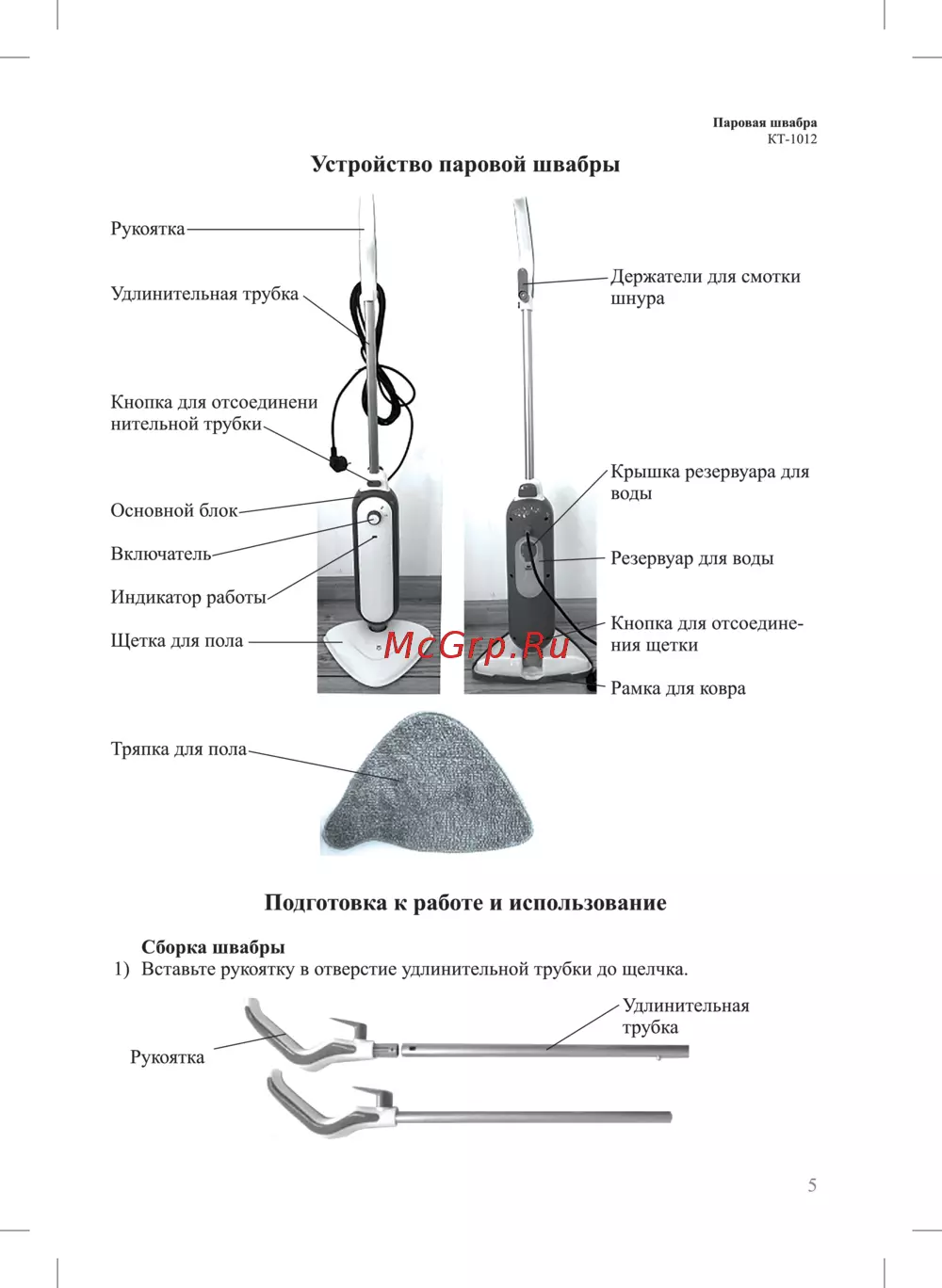 Паровая швабра КТ 1012 Устройство паровой швабры Держатели для смотки шнура Крышка резервуара для воды Резервуар для воды Кнопка для отсоедине ния щетки Рамка для ковра Тряпка для Подготовка к работе и использование Сборка швабры 1 Вставьте рукоятку в отверстие удлинительной трубки до щелчка Удлинительная трубка Рукоятка 5