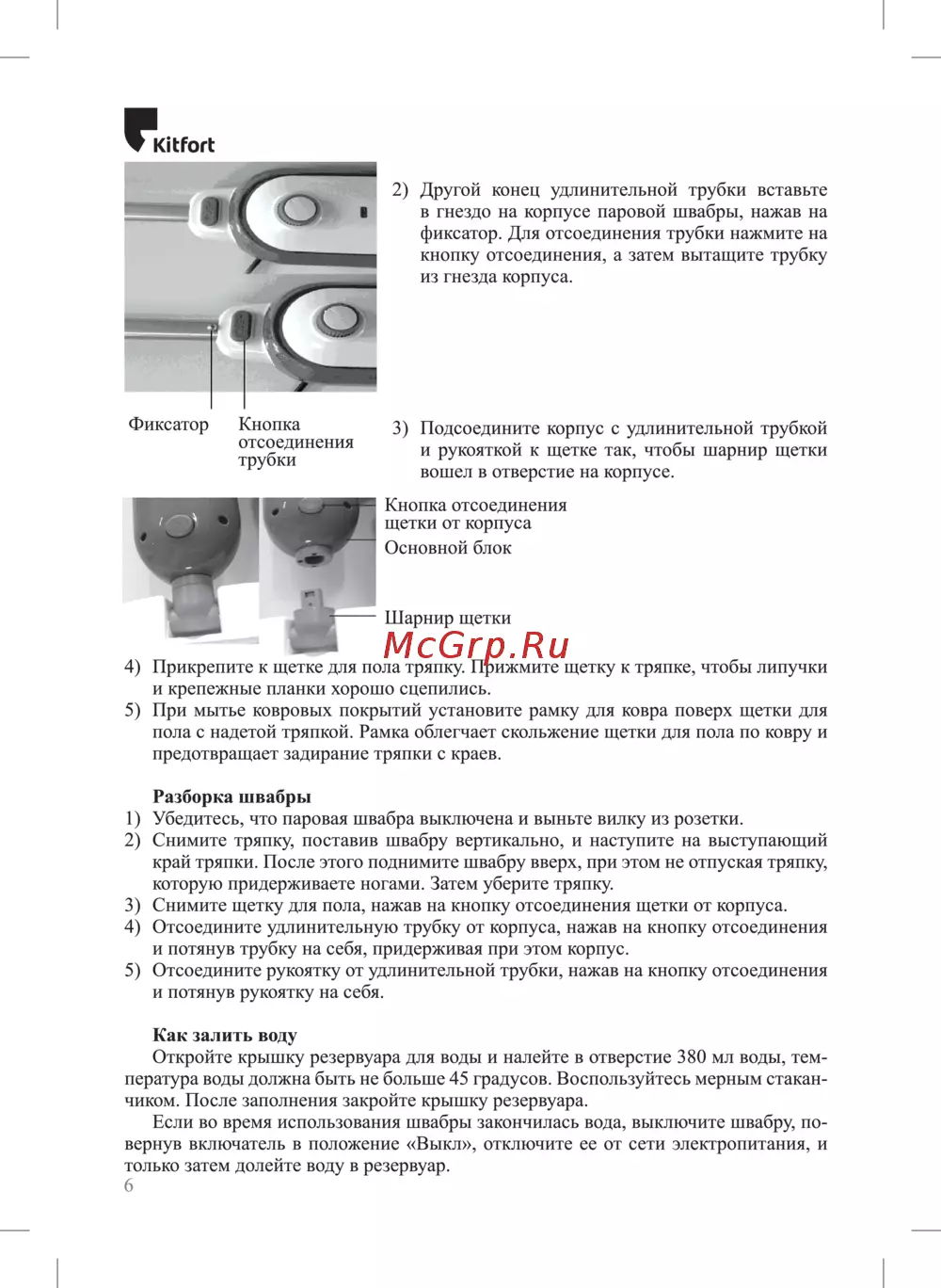 К 1ГогС 2 Другой конец удлинительной трубки вставьте в гнездо на корпусе паровой швабры нажав на фиксатор Для отсоединения трубки нажмите на кнопку отсоединения а затем вытащите трубку из гнезда корпуса Фиксатор Кнопка отсоединения трубки 3 Подсоедините корпус с удлинительной трубкой и рукояткой к щетке так чтобы шарнир щетки вошел в отверстие на корпусе Кнопка отсоединения щетки от корпуса Основной блок Шарнир щетки 4 Прикрепите к щетке для пола тряпку Прижмите щетку к тряпке чтобы липучки и крепежные планки хорошо сцепились 5 При мытье ковровых покрытий установите рамку для ковра поверх щетки для пола с надетой тряпкой Рамка облегчает скольжение щетки для пола по ковру и предотвращает задирание тряпки с краев Разборка швабры 1 Убедитесь что паровая швабра выключена и выньте вилку из розетки 2 Снимите тряпку поставив швабру вертикально и наступите на выступающий край тряпки После этого поднимите швабру вверх при этом не отпуская тряпку которую придерживаете ногами Затем уберите тряпку 3 Снимите щетку для пола нажав на кнопку отсоединения щетки от корпуса 4 Отсоедините удлинительную трубку от корпуса нажав на кнопку отсоединения и потянув трубку на себя придерживая при этом корпус 5 Отсоедините рукоятку от удлинительной трубки нажав на кнопку отсоединения и потянув рукоятку на себя Как залить воду Откройте крышку резервуара для воды и налейте в отверстие 380 мл воды тем пература воды должна быть не больше 45 градусов Воспользуйтесь мерным стакан чиком После заполнения закройте крышку резервуара Если во время использования швабры закончилась вода выключите швабру по вернув включатель в положение Выкл отключите ее от сети электропитания и только затем долейте воду в резервуар 6