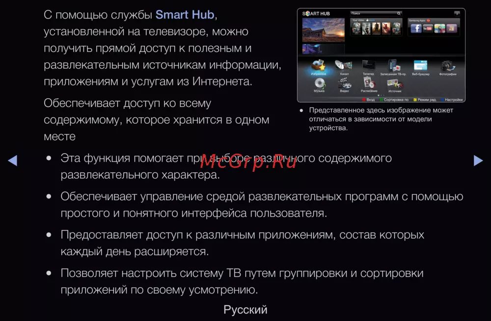 Служба Smart Hub на телевизоре предоставляет простой доступ к развлекательным приложениям и информации из Интернета, упрощая выбор контента и управление им.