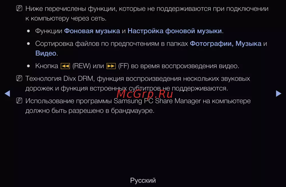 Samsung UE40D6100SW — ограничения функций при подключении через сеть к компьютеру [227/318]