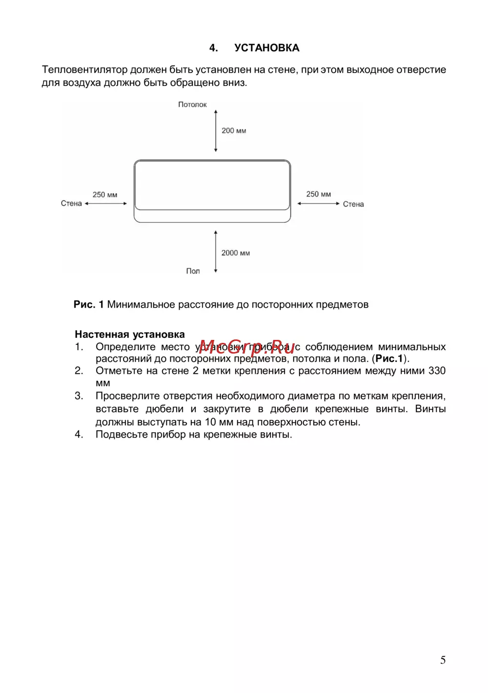 Тепловентилятор должен быть установлен на стене, при этом выходное отверстие