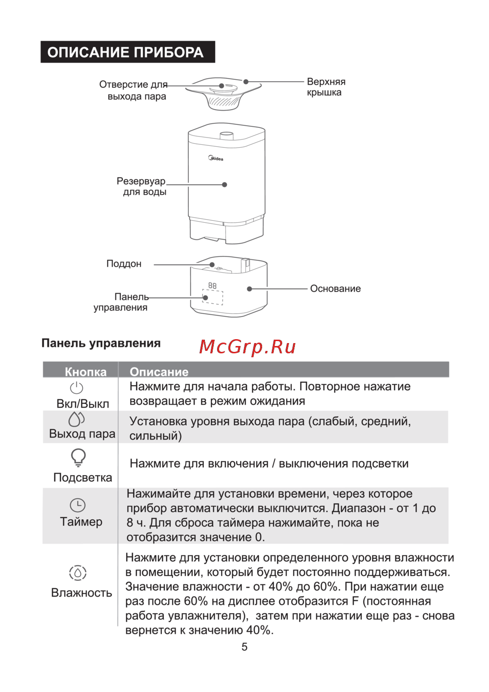 Midea MHU-2954 — управление увлажнителем: функции и настройки [6/12]