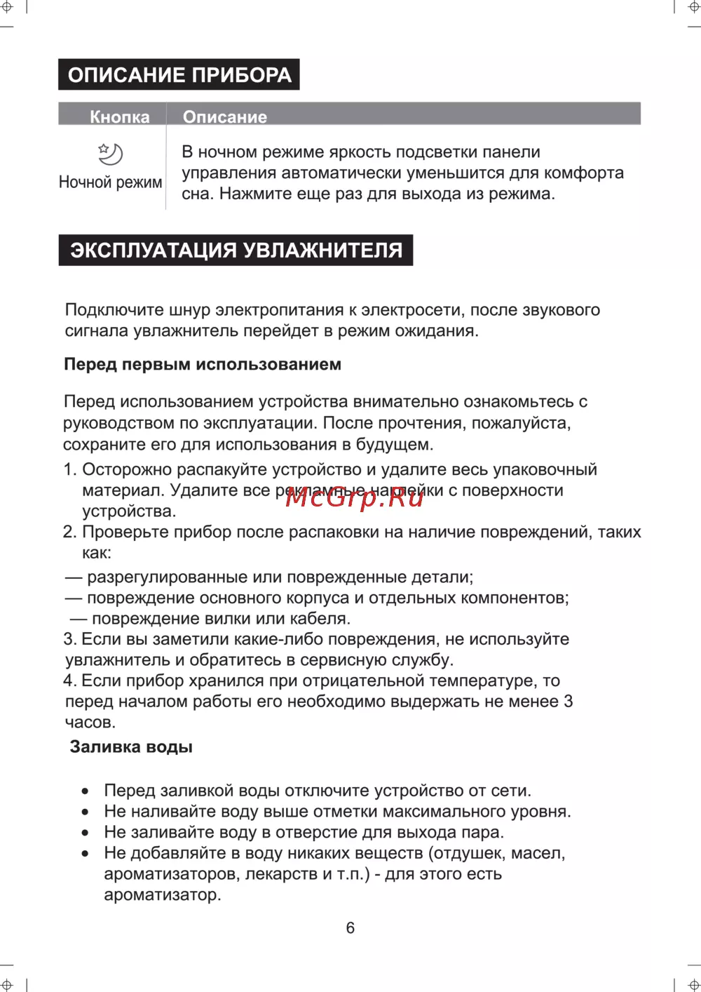 ОПИСАНИЕ ПРИБОРА Кнопка Описание В ночном режиме яркость подсветки панели управления автоматически уменьшится для комфорта Ночной режим сна Нажмите еще раз для выхода из режима ЭКСПЛУАТАЦИЯ УВЛАЖНИТЕЛЯ Подключите шнур электропитания к электросети после звукового сигнала увлажнитель перейдет в режим ожидания Перед первым использованием Перед использованием устройства внимательно ознакомьтесь с руководством по эксплуатации После прочтения пожалуйста сохраните его для использования в будущем 1 Осторожно распакуйте устройство и удалите весь упаковочный материал Удалите все рекламные наклейки с поверхности устройства 2 Проверьте прибор после распаковки на наличие повреждений таких как разрегулированные или поврежденные детали повреждение основного корпуса и отдельных компонентов повреждение вилки или кабеля 3 Если вы заметили какие либо повреждения не используйте увлажнитель и обратитесь в сервисную службу 4 Если прибор хранился при отрицательной температуре то перед началом работы его необходимо выдержать не менее 3 часов Заливка воды Перед заливкой воды отключите устройство от сети Не наливайте воду выше отметки максимального уровня Не заливайте воду в отверстие для выхода пара Не добавляйте в воду никаких веществ отдушек масел ароматизаторов лекарств и т п для этого есть ароматизатор 6
