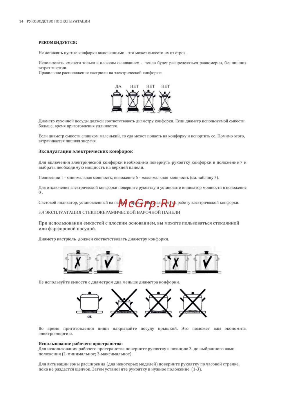 14 РУКОВОДСТВО ПО ЭКСПЛУАТАЦИИ РЕКОМЕНДУЕТСЯ Не оставлять пустые конфорки включенными это може т вывести их из строя Использовать емкости только с плоским основанием тепло будет распределяться равномерно без лишних затрат энергии Правильное расположение кастрюли на электрической конфорке ДА НЕТ НЕТ НЕТ Диаметр кухонной посуды должен соответствовать диаметру конфорки Если диаметр используемой емкости больше время приготовления удлиняется Если диаметр емкости слишком маленький то еда можег попасть на конфорку и испортить ее Помимо этого затрачивается лишняя энергия Эксплуатация электрических конфорок Для включения электрической конфорки необходимо выбрать необходимую мощность на верхней панели повернуть рукоятку конфорки в положение 7 и Положение I минимальная мощность положение 6 максимальная мощность см таблицу 3 Для отключения электрической конфорки поверните рукоятку и установите индикатор мощности в положение 0 Световой индикатор установленный на панели управления указывает на работу электрической конфорки 3 4 ЭКСПЛУАТАЦИЯ СТЕКЛОКЕРАМИЧЕСКОЙ ВАРОЧНОЙ ПАНЕЛИ При использовании емкостей с плоским основанием вы можете пользоваться стеклянной или фарфоровой посудой Диаметр кастрюль должен соответствовать диаметру конфорки Не используйте емкости с диаметром дна меньше диаметра конфорки Во время приготовления пищи накрывайте посуду крышкой Это поможет вам экономить электроэнергию Использование рабочего пространства Для использования рабочего пространства поверните рукоятку в позицию 3 до выбранного вами положения 1 минимальное 3 максимальное Для активации зоны расширения для некоторых моделей поверните рукоятку по часовой стрелке пока не раздастся щелчок Затем установите рукоятку в нужное положение 1 3