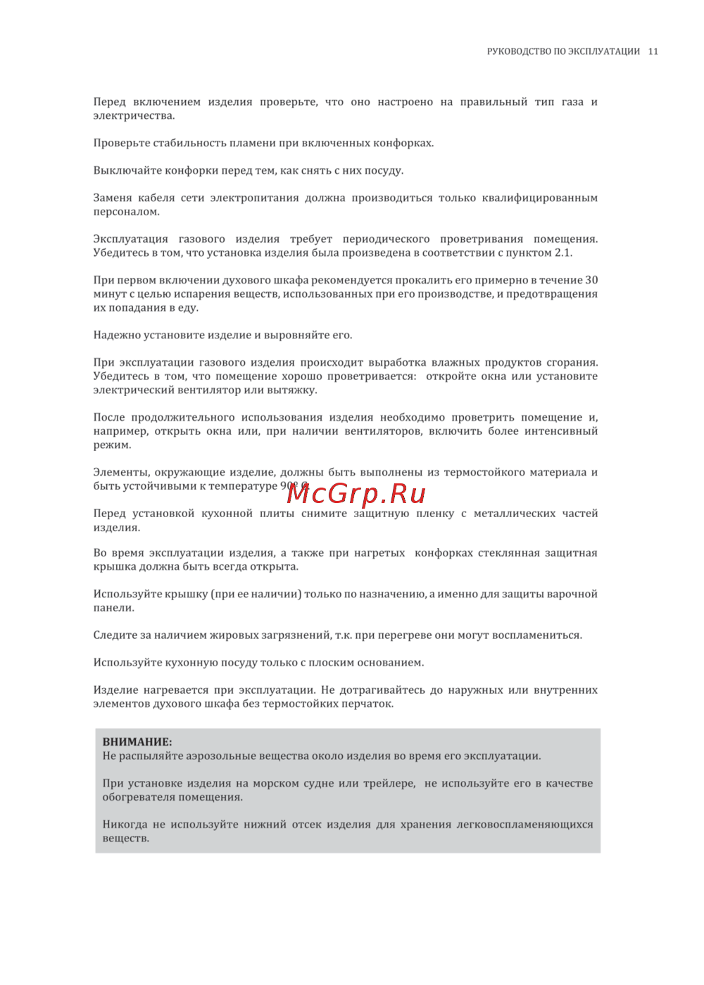РУКОВОДСТВО ПО ЭКСПЛУАТАЦИИ 11 Перед включением изделия проверьте что оно настроено на правильный тип газа и электричества Проверьте стабильность пламени при включенных конфорках Выключайте конфорки перед тем как снять с них посуду Заменя кабеля сети электропитания должна производиться только квалифицированным персоналом Эксплуатация газового изделия требует периодического проветривания помещения Убедитесь в том что установка изделия была произведена в соответствии с пунктом 2 1 При первом включении духового шкафа рекомендуется прокалить его примерно в течение 30 минут с целью испарения веществ использованных при его производстве и предотвращения их попадания в еду Надежно установите изделие и выровняйте его При эксплуатации газового изделия происходит выработка влажных продуктов сгорания Убедитесь в том что помещение хорошо проветривается откройте окна или установите электрический вентилятор или вытяжку После продолжительного использования изделия необходимо проветрить помещение и например открыть окна или при наличии вентиляторов включить более интенсивный режим Элементы окружающие изделие должны быть выполнены из термостойкого материала и быть устойчивыми к температуре 905 С Перед установкой кухонной плиты снимите защитную пленку с металлических частей изделия Во время эксплуатации изделия а также при нагретых конфорках стеклянная защитная крышка должна быть всегда открыта Используйте крышку при ее наличии только по назначению а именно для защиты варочной панели Следите за наличием жировых загрязнений т к при перегреве они могут воспламениться Используйте кухонную посуду только с плоским основанием Изделие нагревается при эксплуатации Не дотрагивайтесь до наружных или внутренних элементов духового шкафа без термостойких перчаток ВНИМАНИЕ Не распыляйте аэрозольные вещества около изделия во время его эксплуатации При установке изделия на морском судне или трейлере не используйте его в качестве обогревателя помещения Никогда не используйте нижний отсек изделия для хранения легковоспламеняющихся веществ