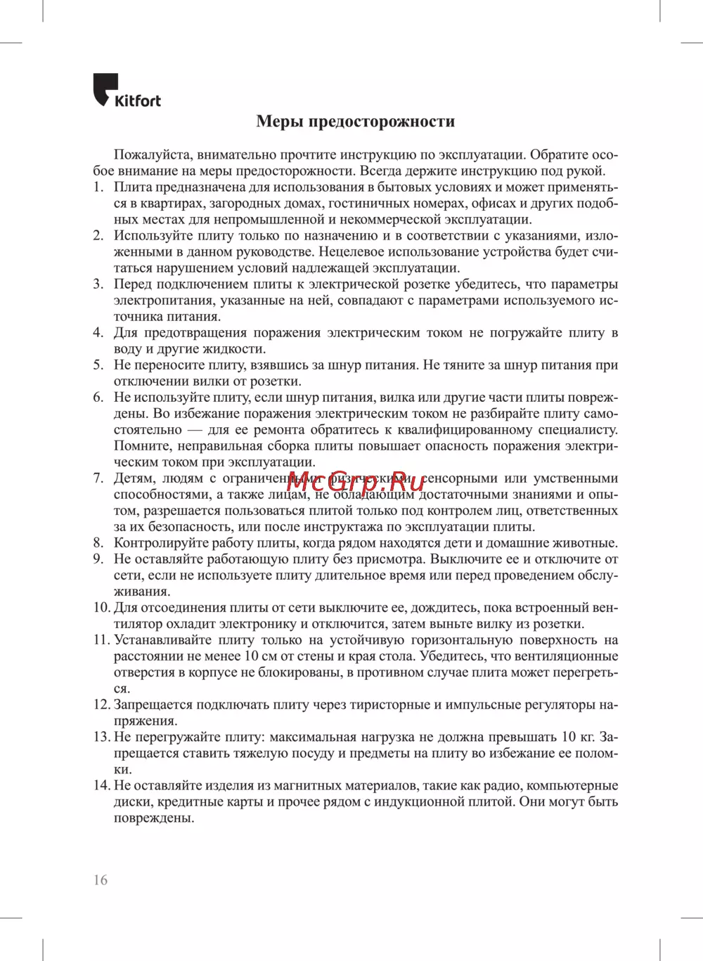 ЮЬГогЬ Меры предосторожности Пожалуйста внимательно прочтите инструкцию по эксплуатации Обратите осо бое внимание на меры предосторожности Всегда держите инструкцию под рукой 1 Плита предназначена для использования в бытовых условиях и может применять ся в квартирах загородных домах гостиничных номерах офисах и других подоб ных местах для непромышленной и некоммерческой эксплуатации 2 Используйте плиту только по назначению и в соответствии с указаниями изло женными в данном руководстве Нецелевое использование устройства будет счи таться нарушением условий надлежащей эксплуатации 3 Перед подключением плиты к электрической розетке убедитесь что параметры электропитания указанные на ней совпадают с параметрами используемого ис точника питания 4 Для предотвращения поражения электрическим током не погружайте плиту в воду и другие жидкости 5 Не переносите плиту взявшись за шнур питания Не тяните за шнур питания при отключении вилки от розетки 6 Не используйте плиту если шнур питания вилка или другие части плиты повреж дены Во избежание поражения электрическим током не разбирайте плиту само стоятельно для ее ремонта обратитесь к квалифицированному специалисту Помните неправильная сборка плиты повышает опасность поражения электри ческим током при эксплуатации 7 Детям людям с ограниченными физическими сенсорными или умственными способностями а также лицам не обладающим достаточными знаниями и опы том разрешается пользоваться плитой только под контролем лиц ответственных за их безопасность или после инструктажа по эксплуатации плиты 8 Контролируйте работу плиты когда рядом находятся дети и домашние животные 9 Не оставляйте работающую плиту без присмотра Выключите ее и отключите от сети если не используете плиту длительное время или перед проведением обслу живания 10 Для отсоединения плиты от сети выключите ее дождитесь пока встроенный вен тилятор охладит электронику и отключится затем выньте вилку из розетки 11 Устанавливайте плиту только на устойчивую горизонтальную поверхность на расстоянии не менее 10 см от стены и края стола Убедитесь что вентиляционные отверстия в корпусе не блокированы в противном случае плита может перегреть ся 12 Запрещается подключать плиту через тиристорные и импульсные регуляторы на пряжения 13 Не перегружайте плиту максимальная нагрузка не должна превышать 10 кг За прещается ставить тяжелую посуду и предметы на плиту во избежание ее полом ки 14 Не оставляйте изделия из магнитных материалов такие как радио компьютерные диски кредитные карты и прочее рядом с индукционной плитой Они могут быть повреждены 16