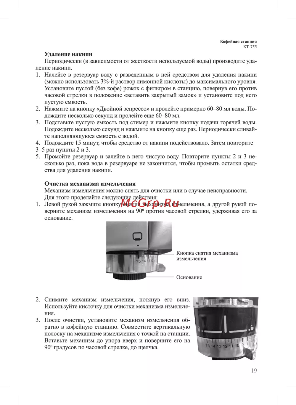 Кофейная станция КТ 755 Удаление накипи Периодически в зависимости от жесткости используемой воды производите уда ление накипи 1 Налейте в резервуар воду с разведенным в ней средством для удаления накипи можно использовать 3 й раствор лимонной кислоты до максимального уровня Установите пустой без кофе рожок с фильтром в станцию повернув его против часовой стрелки в положение вставить закрытый замок и установите под него пустую емкость 2 Нажмите на кнопку Двойной эспрессо и пролейте примерно 60 80 мл воды По дождите несколько секунд и пролейте еще 60 80 мл 3 Подставьте пустую емкость под стимер и нажмите кнопку подачи горячей воды Подождите несколько секунд и нажмите на кнопку еще раз Периодически сливай те наполняющуюся емкость с водой 4 Подождите 15 минут чтобы средство от накипи подействовало Затем повторите 3 5 раз пункты 2 и 3 5 Промойте резервуар и залейте в него чистую воду Повторите пункты 2 и 3 не сколько раз пока вода в резервуаре не закончится чтобы промыть остатки сред ства для удаления накипи Очистка механизма измельчения Механизм измельчения можно снять для очистки или в случае неисправности Для этого проделайте следующие действия 1 Левой рукой зажмите кнопку снятия механизма измельчения а другой рукой по верните механизм измельчения на 90 против часовой стрелки удерживая его за основание Кнопка снятия механизма измельчения Основание 2 Снимите механизм измельчения потянув его вниз Используйте кисточку для очистки механизма измельче ния 3 После очистки установите механизм измельчения об ратно в кофейную станцию Совместите вертикальную полоску на механизме измельчения с точкой на станции Вставьте механизм до упора вверх и поверните его на 90 градусов по часовой стрелке до щелчка 19