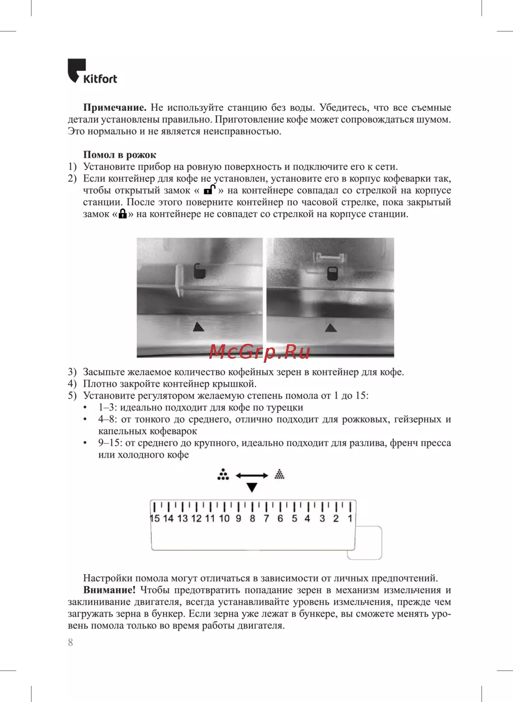КИРог Примечание Не используйте станцию без воды Убедитесь что все съемные детали установлены правильно Приготовление кофе может сопровождаться шумом Это нормально и не является неисправностью Помол в рожок 1 Установите прибор на ровную поверхность и подключите его к сети 2 Если контейнер для кофе не установлен установите его в корпус кофеварки так чтобы открытый замок пп на контейнере совпадал со стрелкой на корпусе станции После этого поверните контейнер по часовой стрелке пока закрытый замок Д на контейнере не совпадет со стрелкой на корпусе станции 3 Засыпьте желаемое количество кофейных зерен в контейнер для кофе 4 Плотно закройте контейнер крышкой 5 Установите регулятором желаемую степень помола от 1 до 15 1 3 идеально подходит для кофе по турецки 4 8 от тонкого до среднего отлично подходит для рожковых гейзерных и капельных кофеварок 9 15 от среднего до крупного идеально подходит для разлива френч пресса или холодного кофе I 1 I 1 I 1 I 1 I 1 I 1 I 1 I 1 I 1 I1 I1 I1 I1 I1 I 15 14 13 12 11 10 9 8 7 6 5 4 3 2 1 Г_ Настройки помола могут отличаться в зависимости от личных предпочтений Внимание Чтобы предотвратить попадание зерен в механизм измельчения и заклинивание двигателя всегда устанавливайте уровень измельчения прежде чем загружать зерна в бункер Если зерна уже лежат в бункере вы сможете менять уро вень помола только во время работы двигателя 8