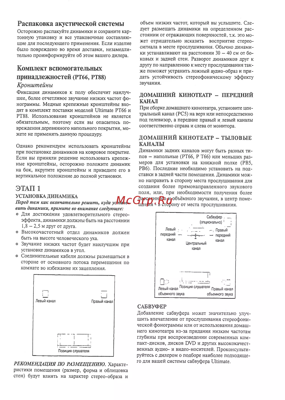 Распаковка акустической системы Осторожно распакуйте динамики и сохраните кар тонную упаковку и все упаковочные составляю щие для последующего применения Если изделие было повреждено во время доставки незамедли тельно проинформируйте об этом вашего дилера Комплект вспомогательных принадлежностей РТ66 РТ88 Кронштейны Фиксация динамиков к полу обеспечит наилуч шее более отчетливое звучание низких частот фо нограммы Медные крепежные кронштейны вхо дят в комплект поставки моделей Ultimate РТбб и РТ88 Использование кронштейнов не является обязательным поэтому если вы опасаетесь по вреждения деревянного напольного покрытия мо жете не применять данную процедуру Однако рекомендуем использовать кронштейны при постановке динамиков на ковровое покрытие Если вы приняли решение использовать крепеж ные кронштейны осторожно положите динамик на бок вкрутите кронштейны и приведите его в вертикальное положение до полной установки ЭТАП 1 УСТАНОВКА ДИНАМИКА Перед тем как окончательно решить куда устано вить динамики примите во внимание следующее Для достижения удовлетворительного стерео эффекта динамики должны быть на расстоянии 1 8 2 5 м друг от друга Высокочастотный отдел динамиков должен быть на высоте человеческого уха Звучание низких частот будет наилучшим при установке динамиков в угол Соединительные кабели должны размещаться в стороне от основного потока перемещения по комнате во избежание их зацепления объем низких частот который вы услышите Сле дует размещать динамики на определенном рас стоянии от отражающих поверхностей т к это мо жет отрицательно исказить восприятие стерео сигнала в месте прослушивания Обычно динами ки устанавливают на расстоянии 30 40 см от бо ковых и задней стен Разворот динамиков друг к другу по направлению к месту прослушивания так же поможет устранить ложный аудио образ и при дать устойчивость стереофоническому эффекту звучания ДОМАШНИЙ КИНОТЕАТР ПЕРЕДНИЙ КАНАЛ При сборке домашнего кинотеатра установите цен тральный канал РС5 на верх или непосредственно под телевизор а передние правый и левый каналы соответственно справа и слева от монитора ДОМАШНИЙ КИНОТЕАТР ТЫЛОВЫЕ КАНАЛЫ Динамики задних каналов могут быть разных ти пов напольные РТ66 Р Тбб или меньших раз меров для установки на книжной полке РВ5 РВ6 Последние необходимо установить на под ставки в задней части помещения Динамики мож но направить в сторону места прослушивания дтя создания более прямонаправленного звукового поля или при необходимости получения более рассеянного и объёмного звучания в центр поме щения в сторону от места прослушивания Сабвуфер опционально Левый Правый передний передний канал канал Центральный канал 0 3 г Левый канал Позиция слушателя объемного звука Правый канал объемного звука САБВУФЕР РЕКОМЕНДАЦИЯ ПО РАЗМЕЩЕНИЮ Характе ристики помещения размер форма и облицовка стен будут влиять на характер стерео образа и Добавление сабвуфера может значительно улуч шить впечатление от прослушивания стереофони ческой фонограммы или от использования домаш него кинотеатра из за придания низким частотам глубины при воспроизведении современных ком пакт дисков дисков DVD и других высококачест венных аудио и видео носителей Проконсульти руйтесь с дилером о подборе наиболее подходяще го для вашей системы сабвуф