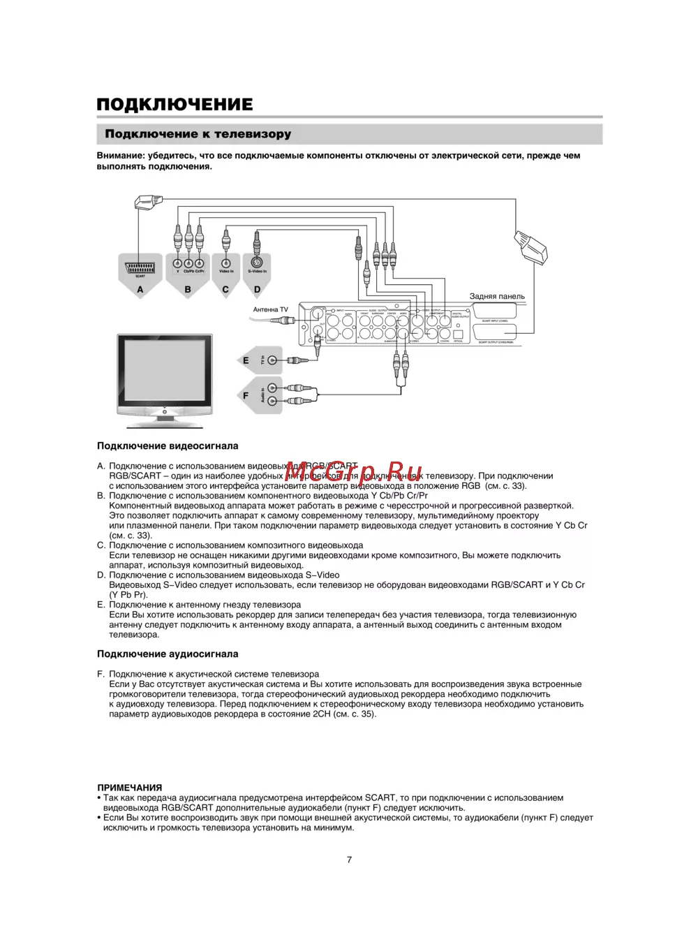 • Так как передача аудиосигнала предусмотрена интерфейсом SCART, то при подключении с использованием