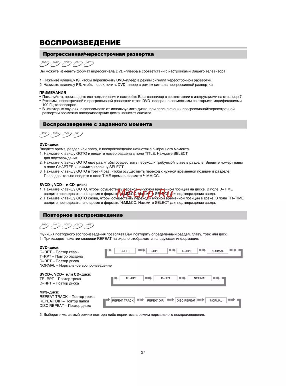 Функция повторного воспроизведения позволяет Вам повторять определенный раздел, главу, трек или диск.