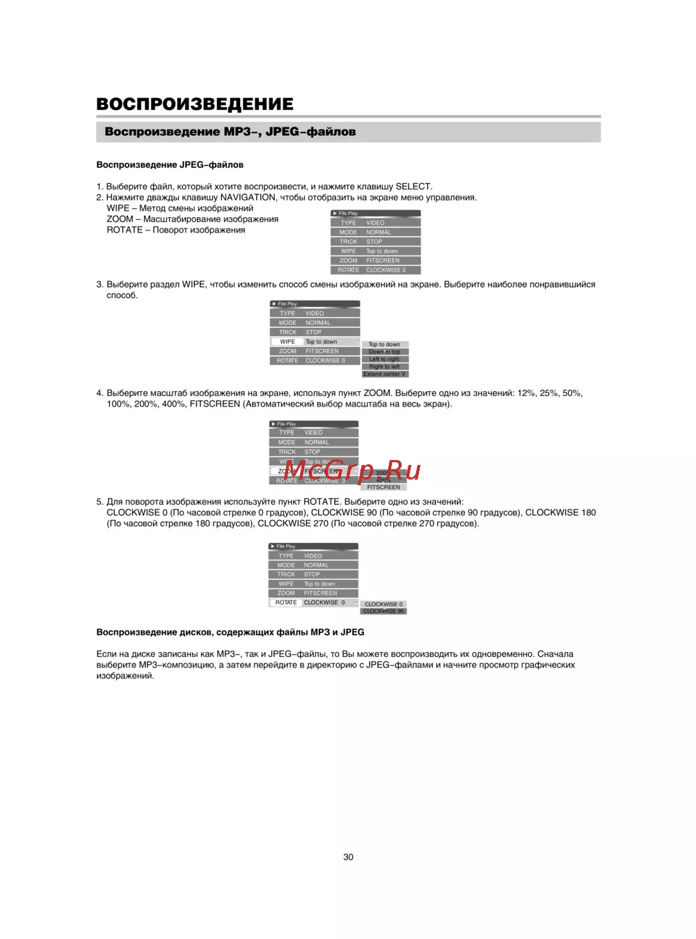 - Выберите файл который хотите воспроизвести и нажмите клавишу select 2 нажмите дважды клавишу navigation чтобы отобразить на экране меню управления wipe метод смены изображений zoom масштабирование изображения rotate поворот изображения p.34