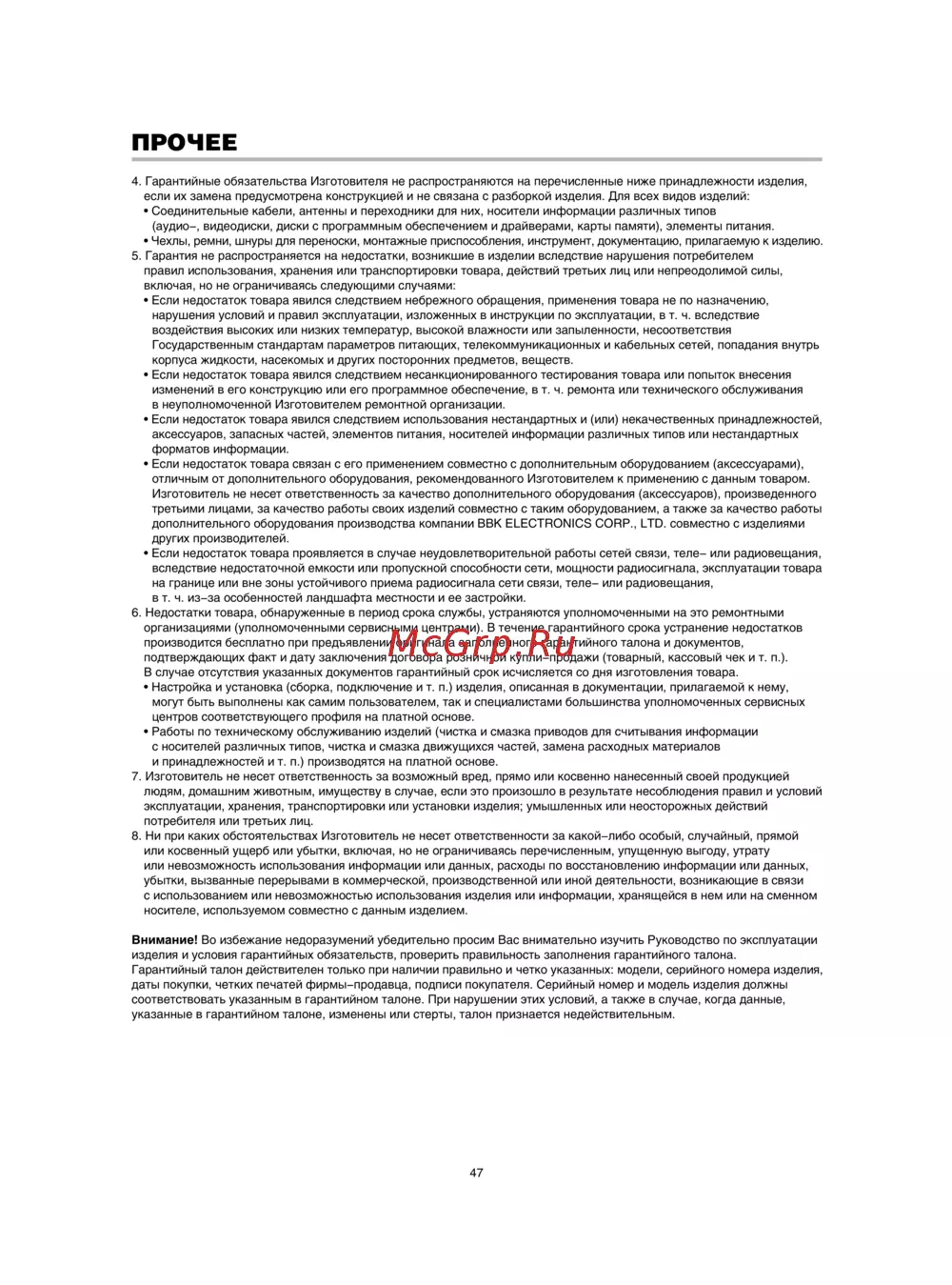 - Условия гарантийных обязательств bbk electronics corp ltd 1 гарантийные обязательства bbk electronics corp ltd далее изготовителя предоставляемые уполномоченными сервисными центрами изготовителя распространяются только на модели предназначенные bbk electronics corp ltd для поставок и реализации на территории страны где предоставляется гарантийное обслуживание приобретенные в этой стране прошедшие сертификацию на соответствие гостам этой страны и маркированные официальными знаками соответствия 2 гарантийные обязательства изготовителя действуют в рамках законодательства о защите прав потребителей и регулируются законодательством страны на территории которой они предоставлены и только при условии использования изделия исключительно для личных семейных или домашних нужд гарантийные обязательства изготовителя не распространяются на случаи использования товаров в целях осуществления предпринимательской деятельности либо в связи с приобретением товаров в целях удовлетворения потребностей пред p.50